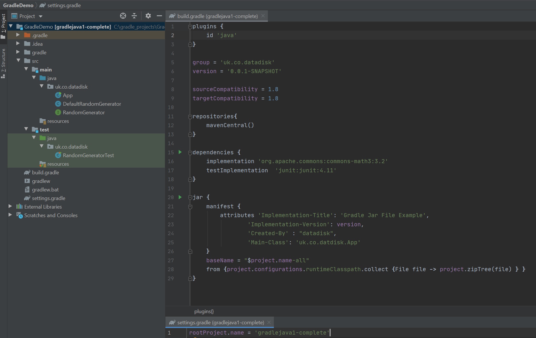 | We can create a number of properties that Gradle can use as part of the build | group = 'uk.co.datadisk' version = '0.0.1-SNAPSHOT' sourceCompatibility = 1.8 // use the JDK version 1.8 targetCompatibility = 1.8 |