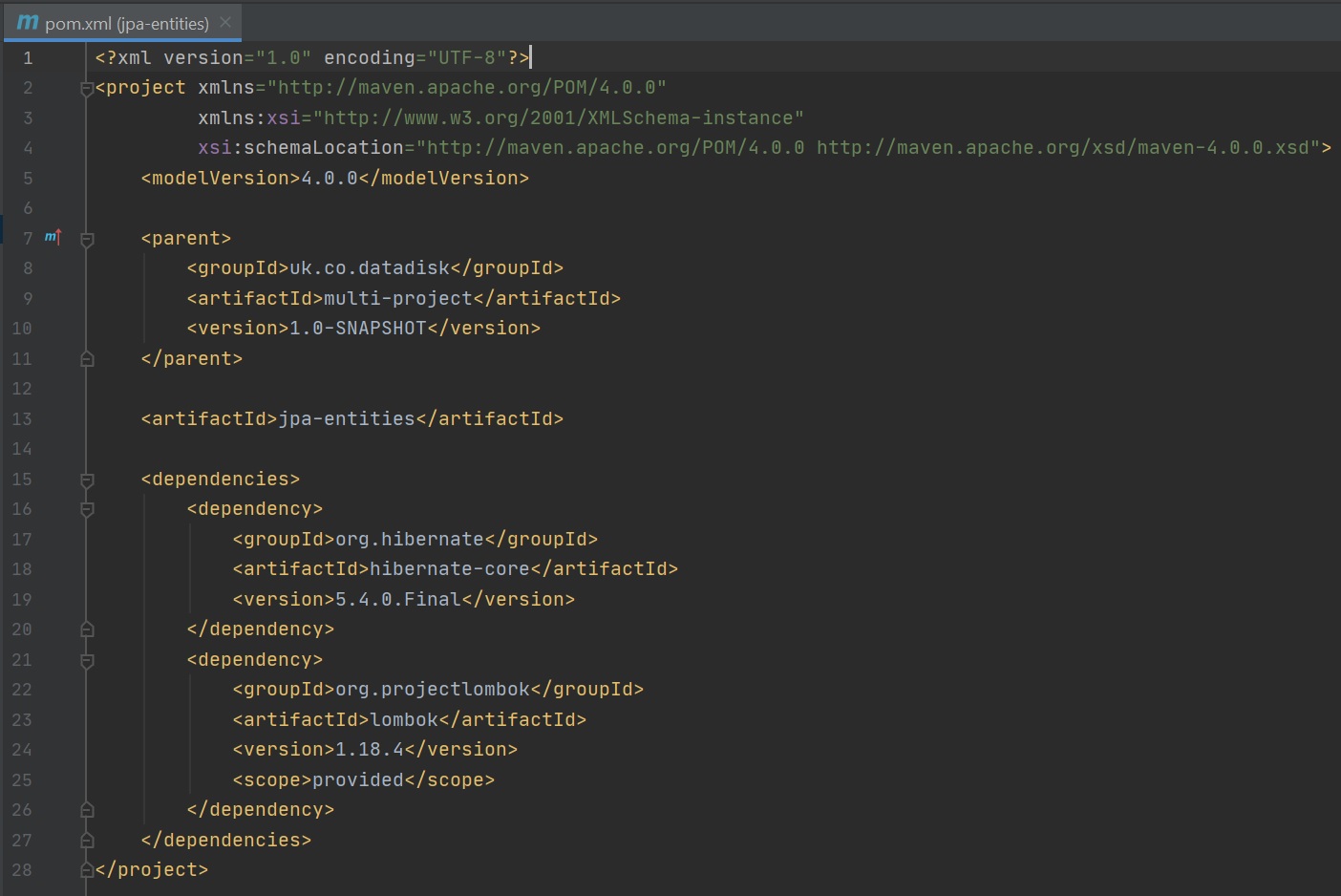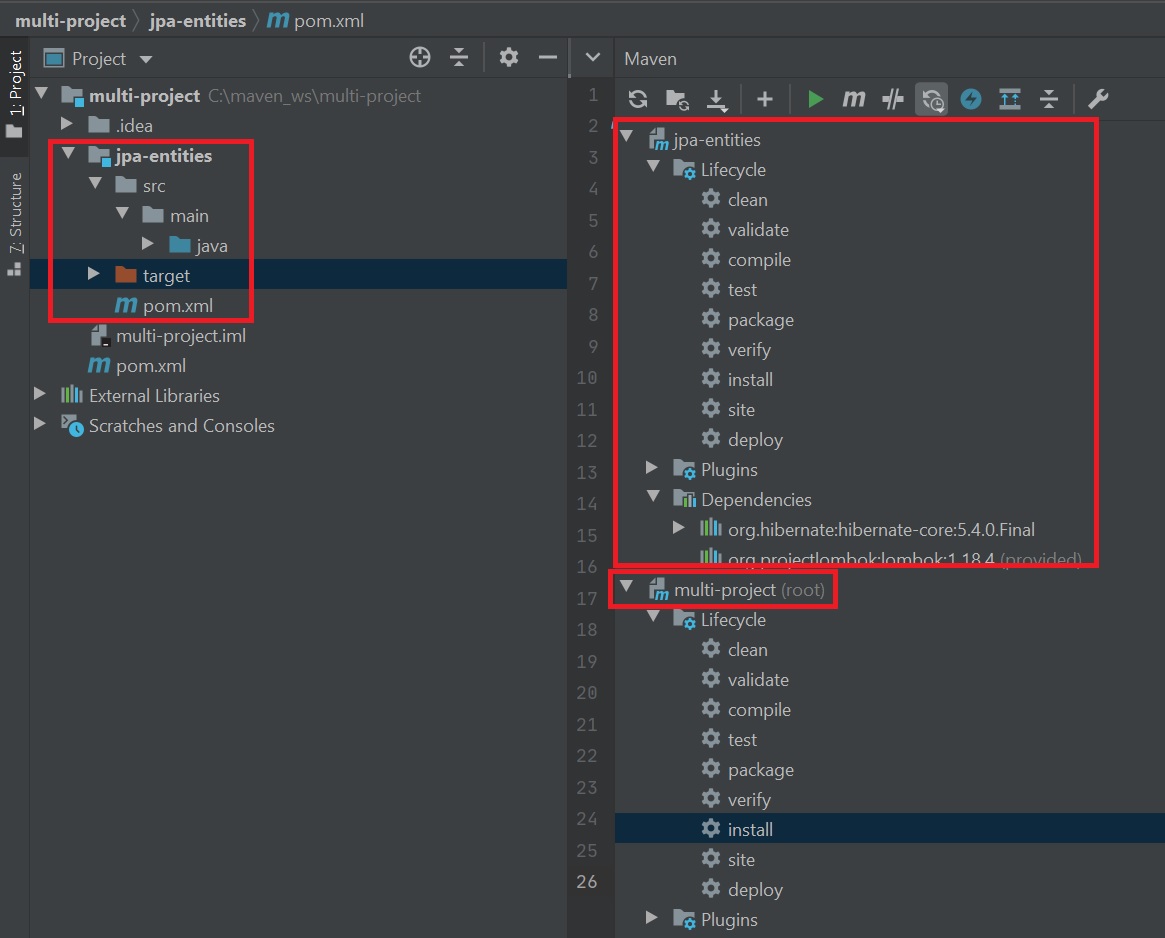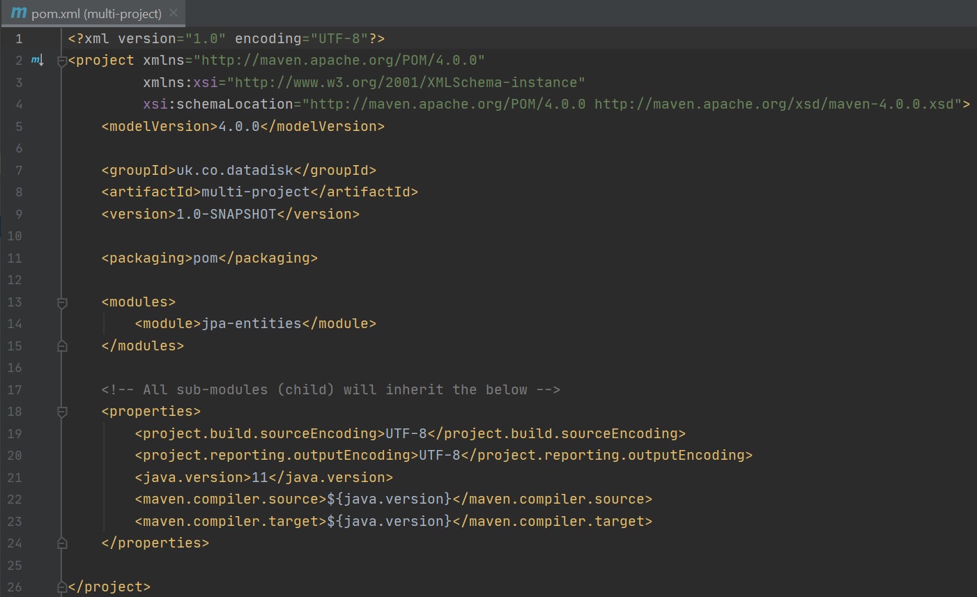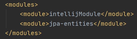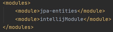 We then update the parent POM file (right screenshot), adding a modules section to see the new jpa-entities module. Also notice in the jpa-entities pom we have added a parent section pointing to the parent POM and some dependencies for that specific module, don't forget to add its own artifactId property. Remember that the sub-module will inherit all the properties in the parent POM.