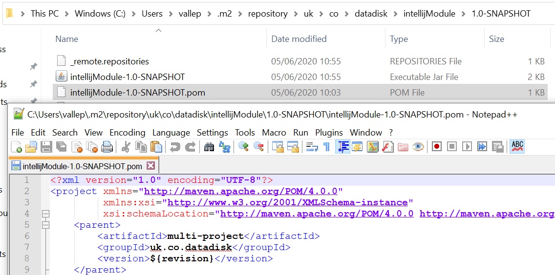 There is a flatten Maven plugin which allows you to replace the ${revision} in the repository code with the correct version value, if you notice in the repository pom file the ${revision} has not been replaced, you can use the flatten plugin to do this. You use the dependencyManagement to declare the dependencies in the whole project (left screenshot), then you declare the specific dependencies for each module (right screenshot), however you can obmit the version as this will be picked by the dependencyManagement.