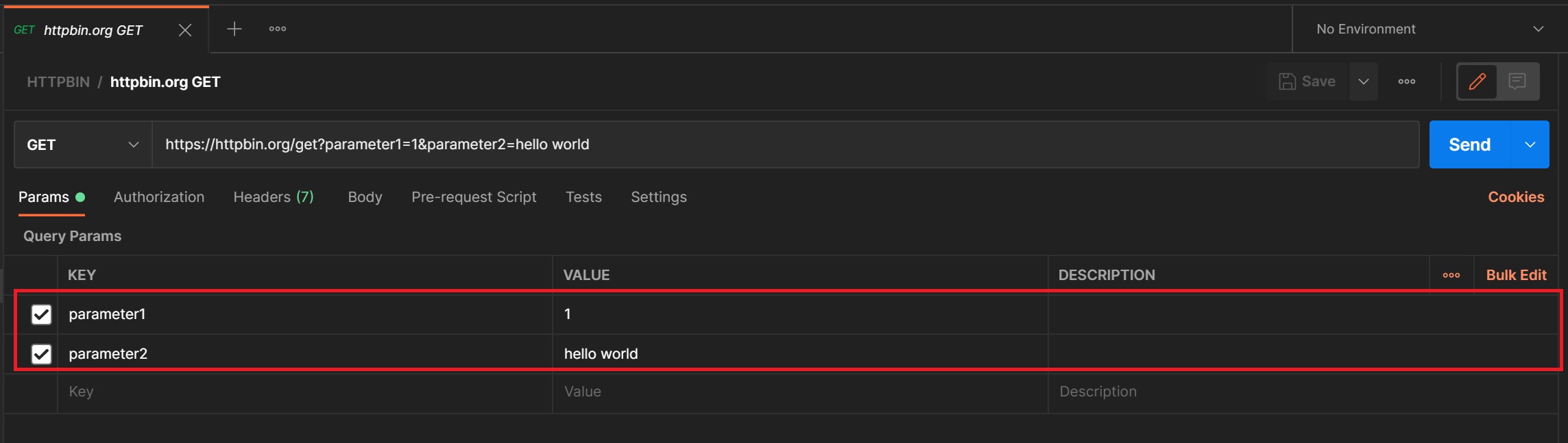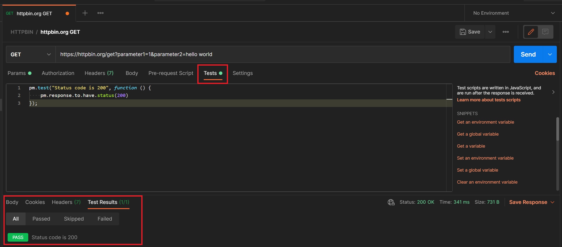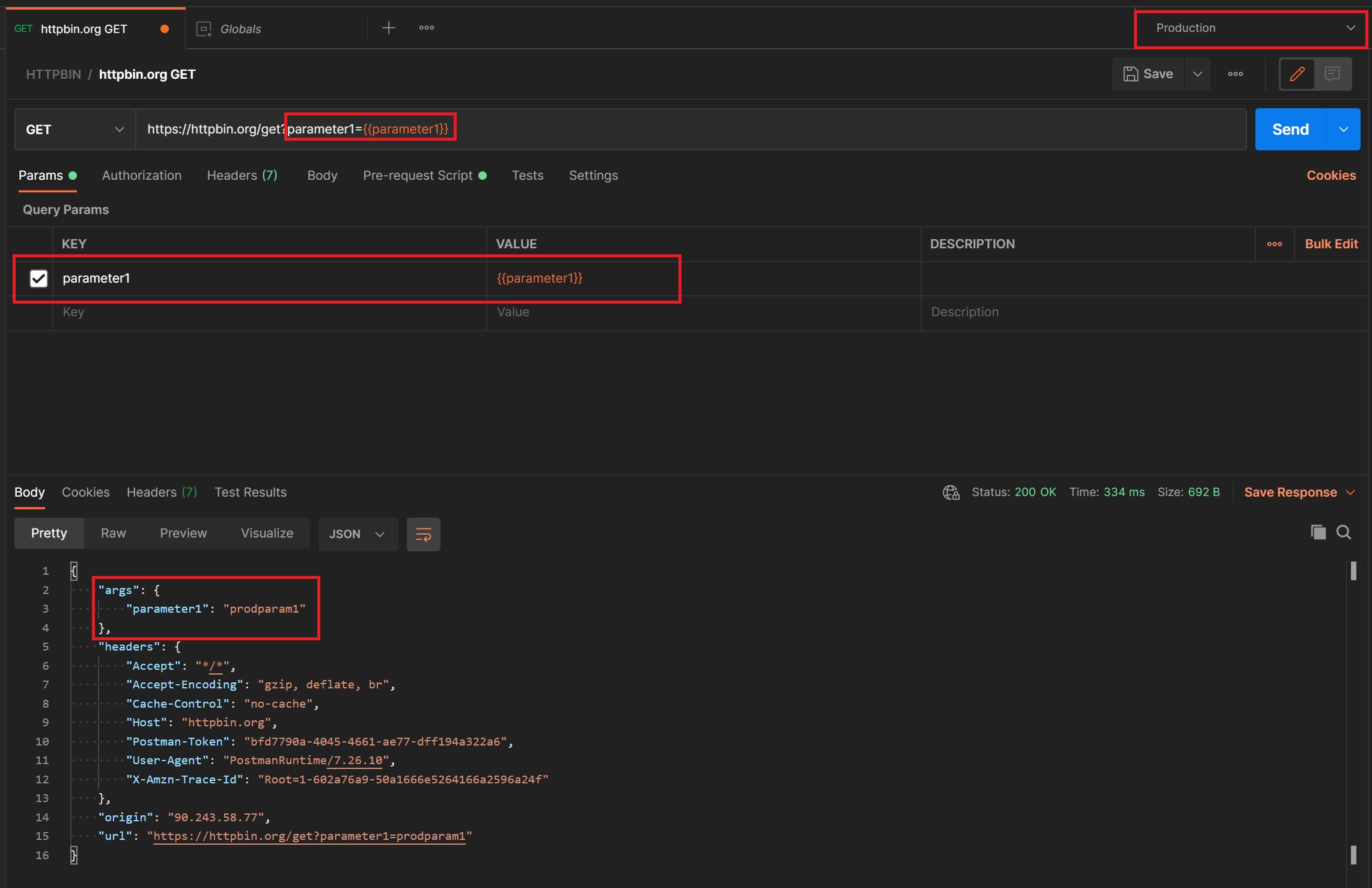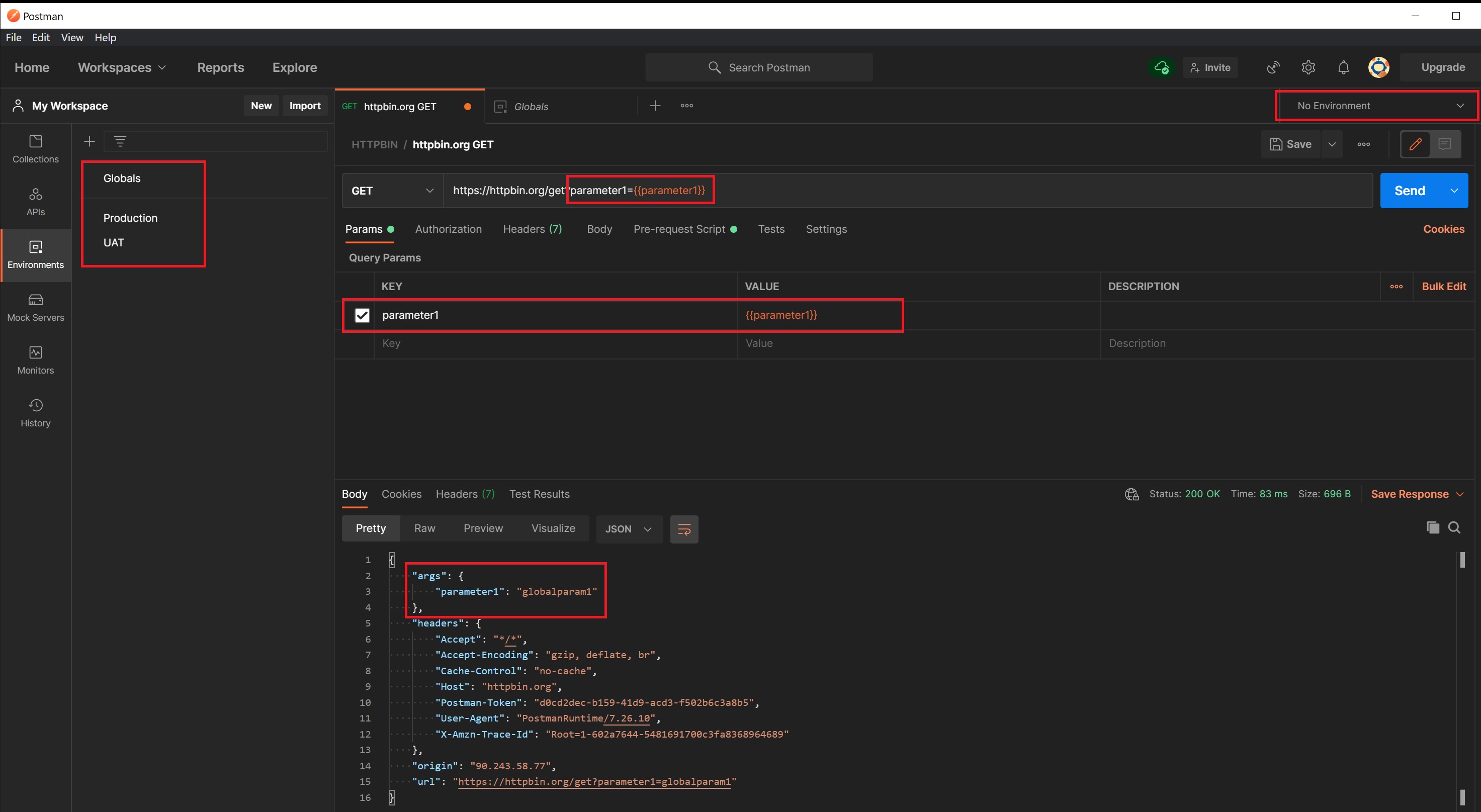 Now to use a variable we use double curly brackets {{}}, note in the top right-hand corner is the environment setting, basically the environment that you are running in and thus what environment variables you will be using, No Environment means you will be using the Globals enviroment we mentioned above. In the test below we use No Environment and as you can see in the results the parameter1 parameter has the value globalparam1 which was retrieved from the Globals environment.