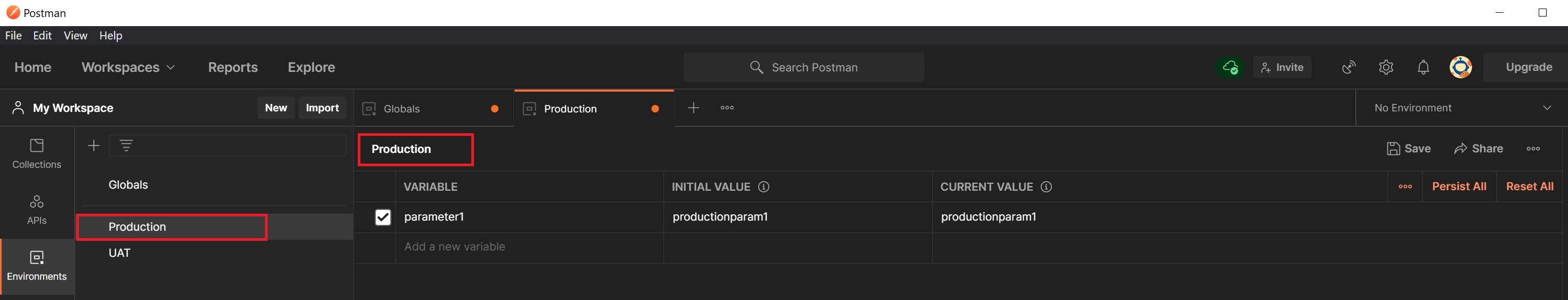 Here you can see that I have created a Production environment with very specific variables, note that you need to click the save button to save the variables otherwise you will lose them