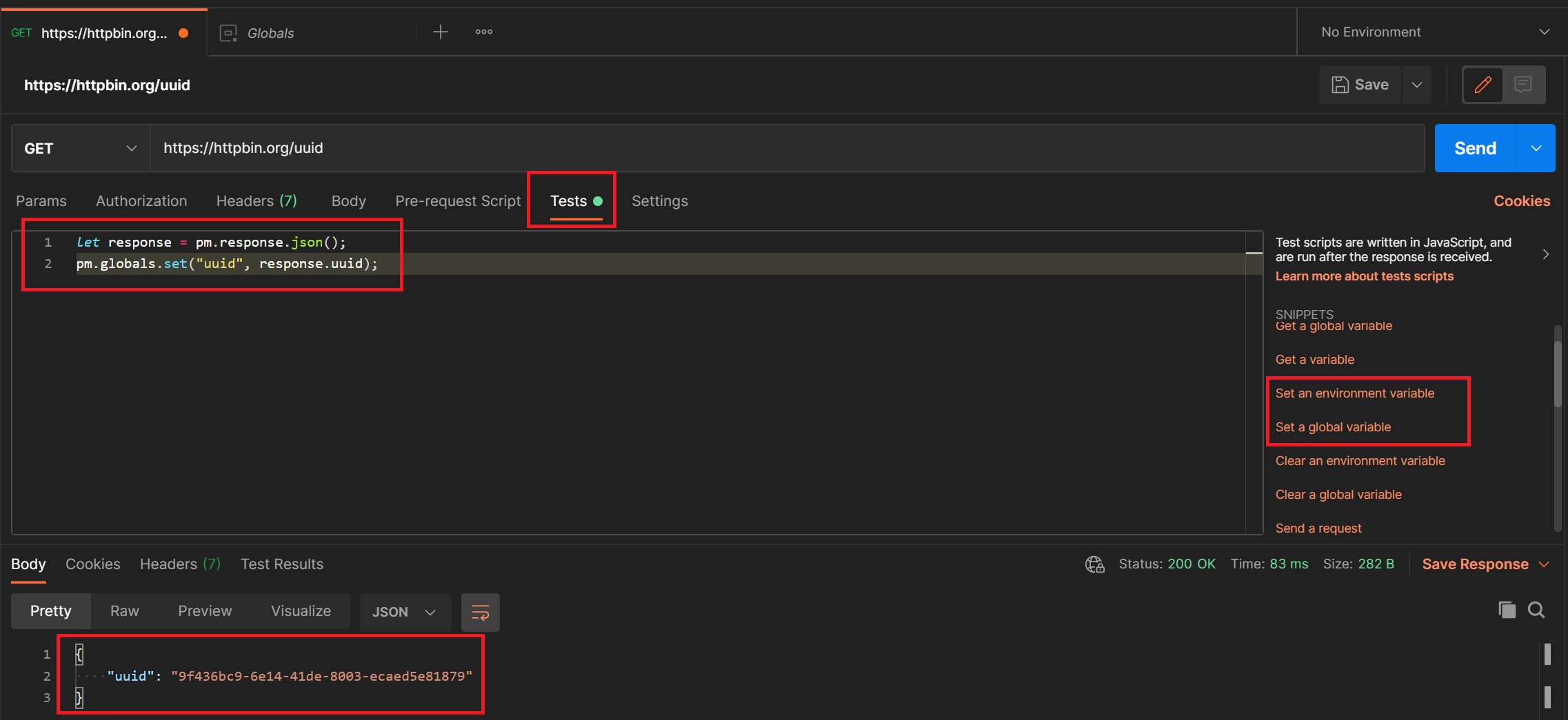 You can also set a variable when we run a request, in the below example I retrieve a uuid by running a request, the retrieved response contains the uuid which is extracted out and then the global uuid variable is set. Notice that on the very right-hand side you have pre-written scripts that if you select are imbedded into your tests screen, you can then adapt to your requirements.