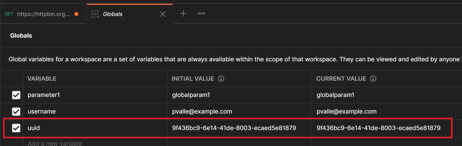 If we return the globals variables you will notice that the uuid variable has now been updated. In later sections we will use the collector runner where we can run multiple saved requests which can be a combination of retrieving data, setting variables and then later scripts use those updated variables.