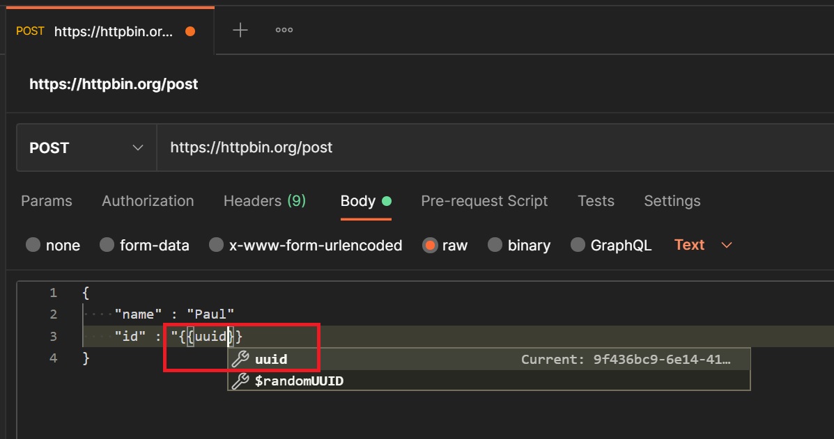 You can also use your variables in things like the body of a post request as per below, notice that postman also have a autofill feature to help you choose what you are trying to do, in my case is has picked up the uuid variable, this goes for variables, scripts, etc.