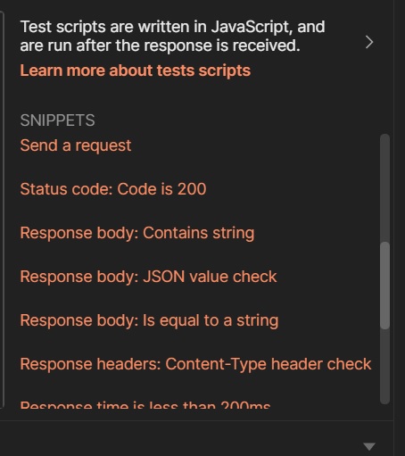 If you notice in the right-hand side there are many test scripts already available for you to use, simply select one and it will be copied into the tests scripts panel for you to use as is or adapt it.
