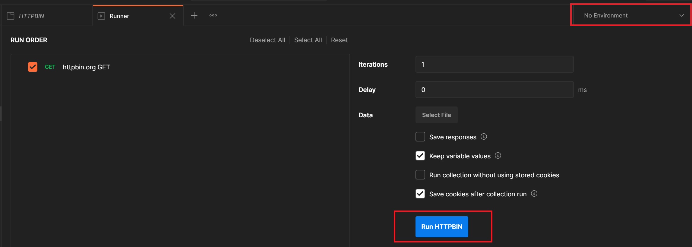 The collections runner allows you to run all saved requests within a colelction, here I select the HTTPBIN collection, you will notice a run button, by sekecting this you are taken to the runner screen