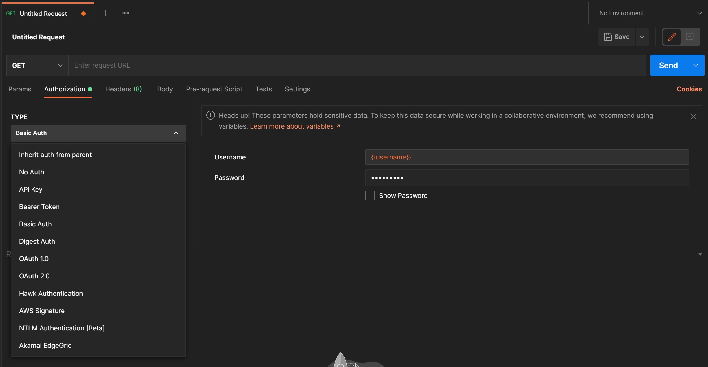 The target server or API may request authentication to process your request, postman supports many types of authentication as you can see below, here I am using a basic auth example, also notice that I am using a variable for the Username
