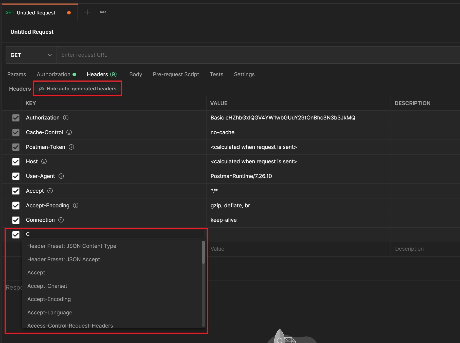 Next we come to headers, HTTP headers let the client and the server pass additional information with an HTTP request or response. An HTTP header consists of its case-insensitive name followed by a colon (:), then by its value, in order to see the headers click on the hidden button, there are many HTTP headers, when adding one Postman uses a autofill feature to ttry and determine the header you require, you can also add you own specific header. If you hoover over a header a tool tip pops up giving information about that header.