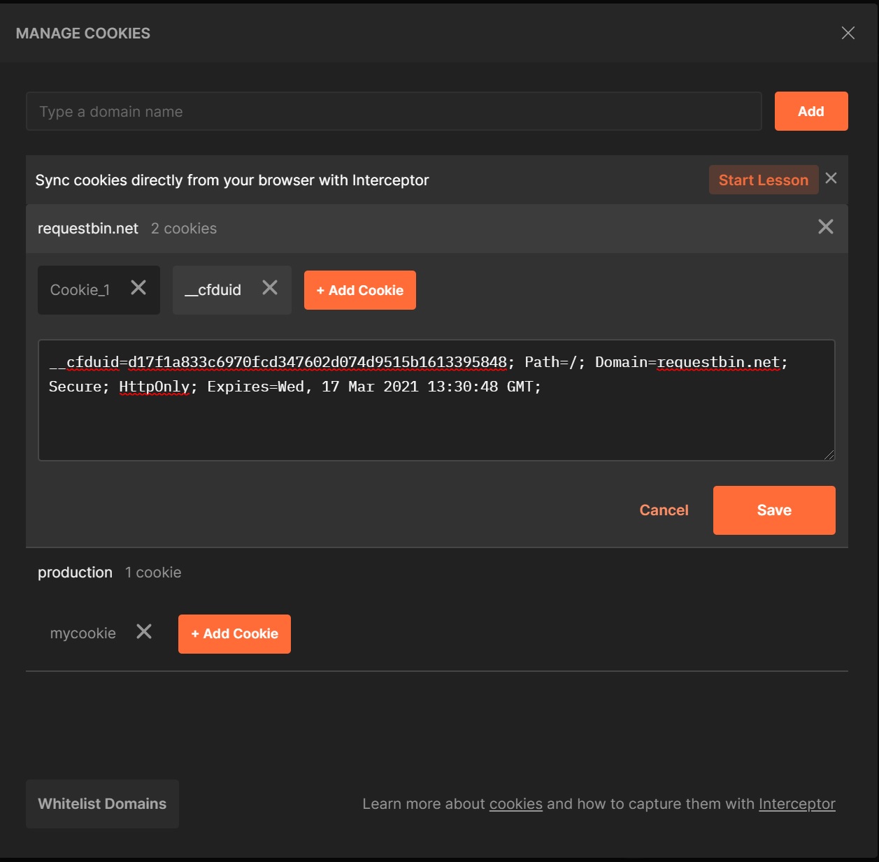 An HTTP cookie (web cookie, browser cookie) is a small piece of data that a server sends to the user's web browser. The browser may store it and send it back with later requests to the same server. Typically, it's used to tell if two requests came from the same browser — keeping a user logged-in, for example. Selecting the cookie button you open up a cookie manager screen, here you can see some cookies that have already been created from previous requests.