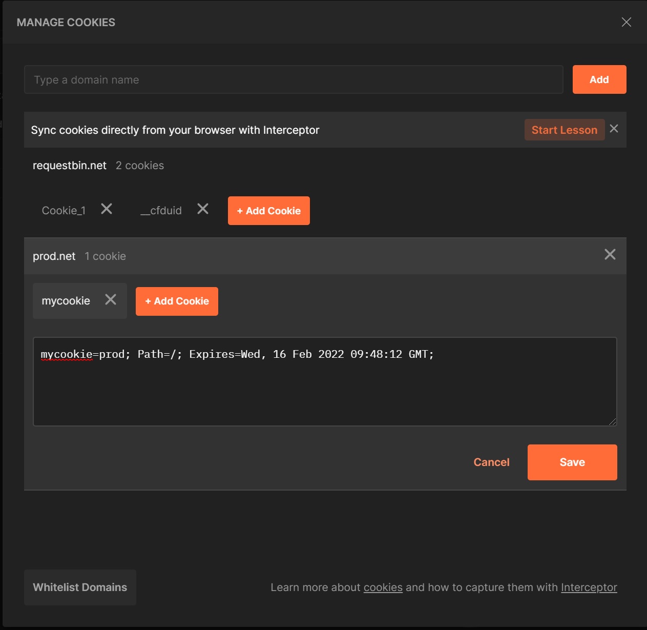 You also can create your own cookies, the basic cookie contains a name, its value and a expiry date, its also used for a specific domain as you can see in my example below, I have created a cookie for the prod.net domain called mycookie with a value of prod.