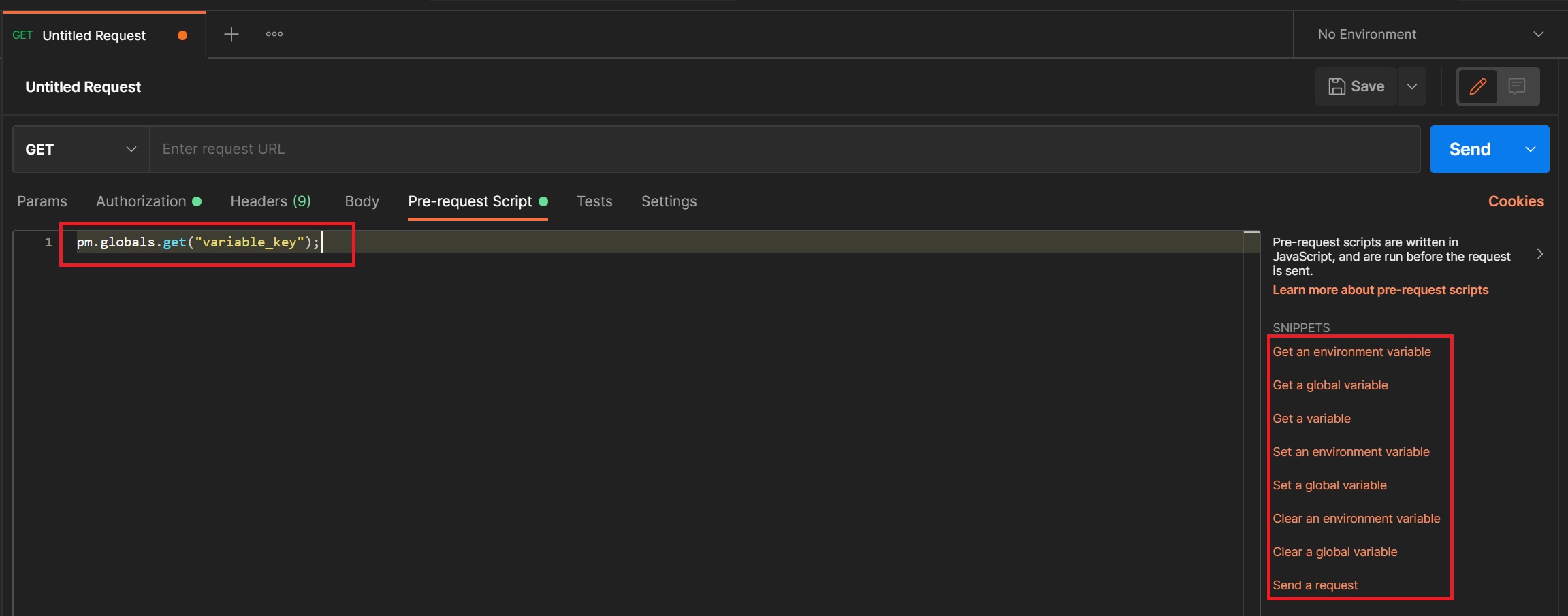 Next we add some pre-request script for example in the below I am obtain a variable, if you look to the right-hand side there are a number of preconfigured scripts, simply select one and it will be created in the scripts panel.