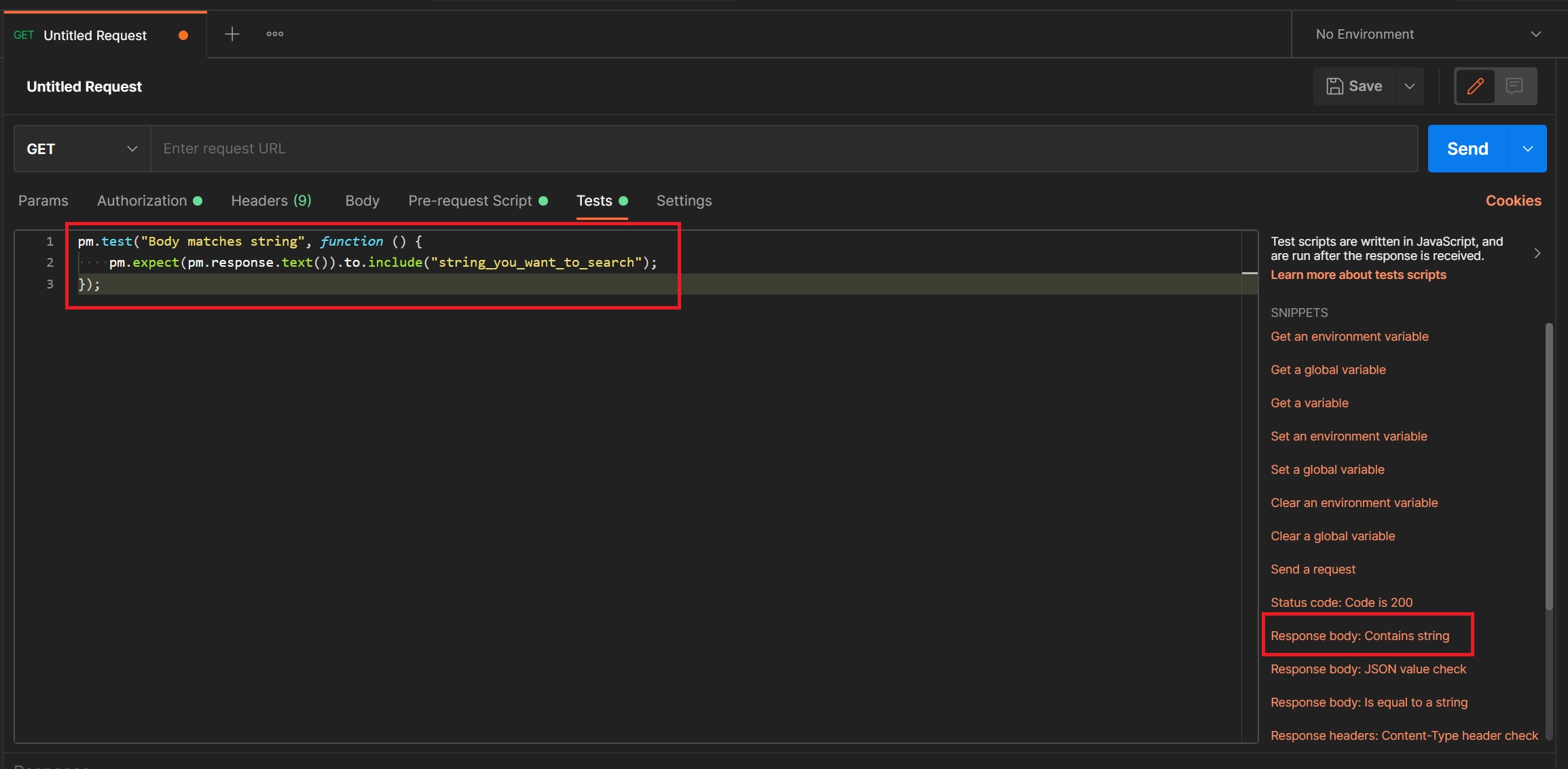 As with pre-request scripts we have many tests that we can use, again in the right-hand side you simply choose one and it will be created in the tests panel, in my example below I selected Response body: Contains string and the code was automatically generated for me.