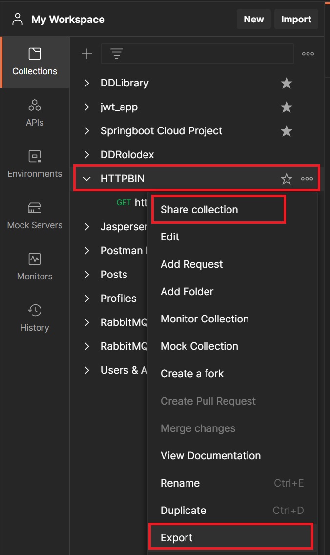 You can share you requests with other staff members, by exporting the collection, select the collection options and then select export, it will be exported as a JSON file or you can share a folder or files