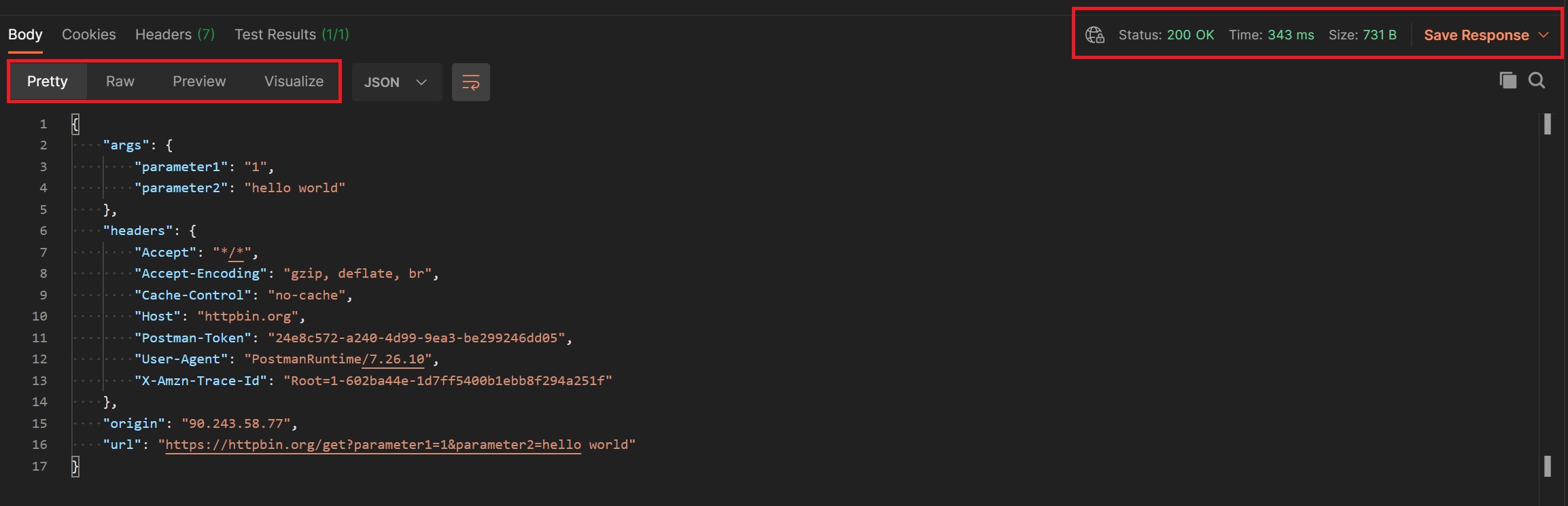 Once you have run your request you can view the result in the result oanel at the bottom of the request, first if you look at the top right-hand side you get various pieces of information about the request the important status code, how long it took (its not deadly acurate) and the size of the response in bytes (useful if transferring large amounts of data). You have a few options on how you want to display the results, pretty format being the most common of which you can view in JSON, XML, HTML, etc. You can also view the response headers and any cookies and if you have setup any tests the results of those tests.