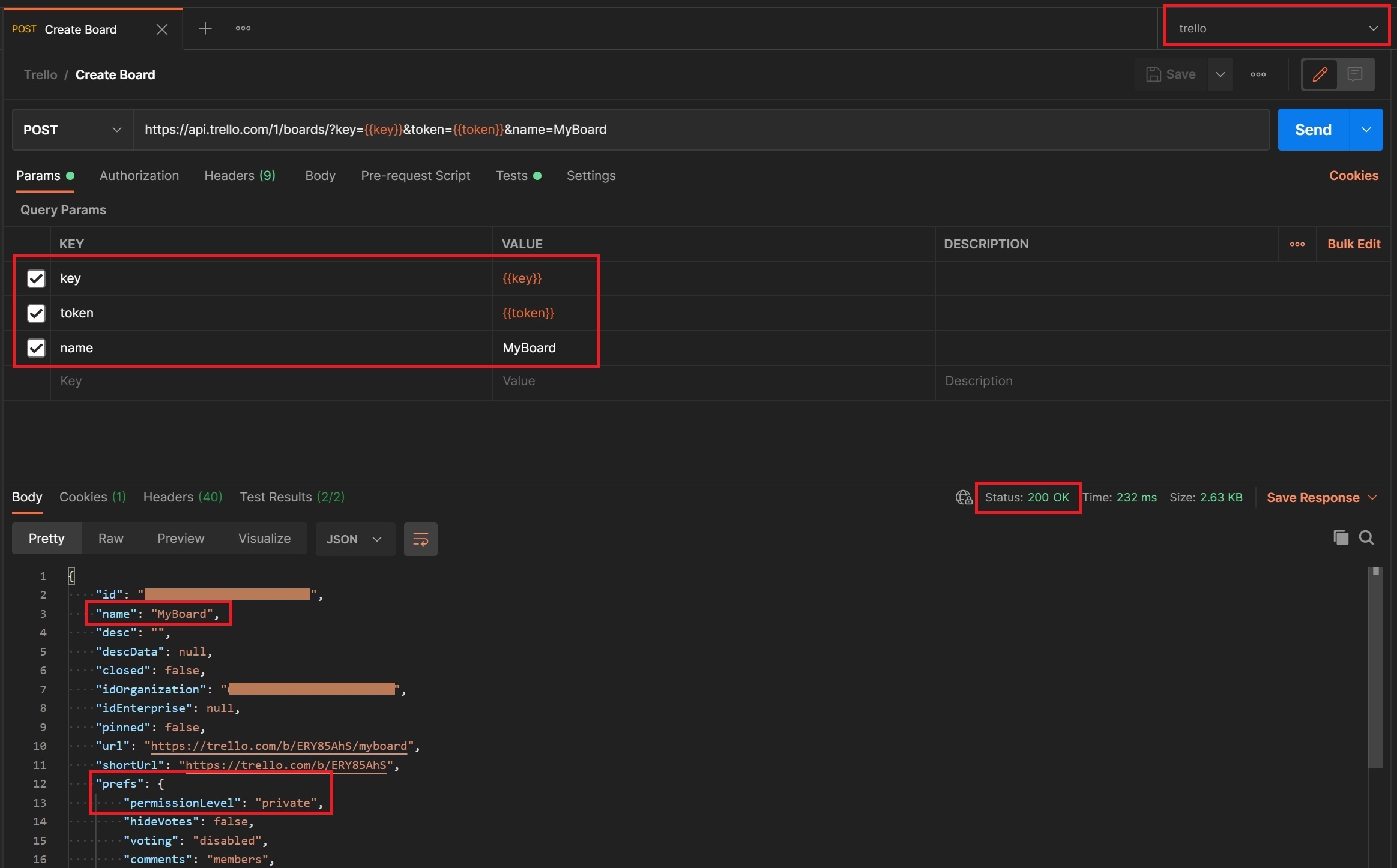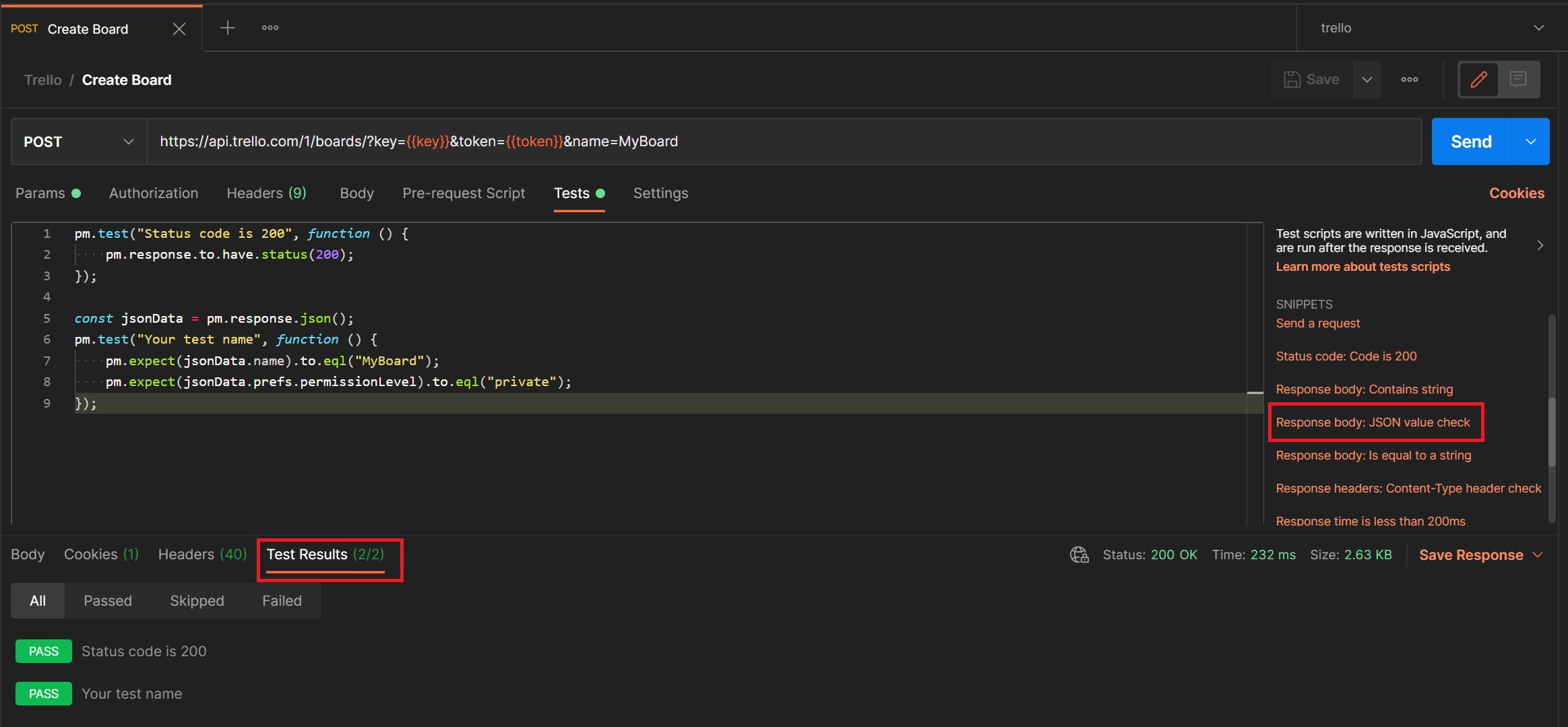 In this section I am going to cover basic test scripts, in the below example I am creating a Trello board, notice that I have created a trello environment with a key and token keys which will be used to login to my Trello account, I then use a name parameter for the board name, I will display the tests in a moment, when you send the request we get some data in the response I have highlighted the name and the premissionLevel which we will test next. Also notice that we get a status code 200 back meaning successful.