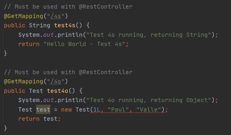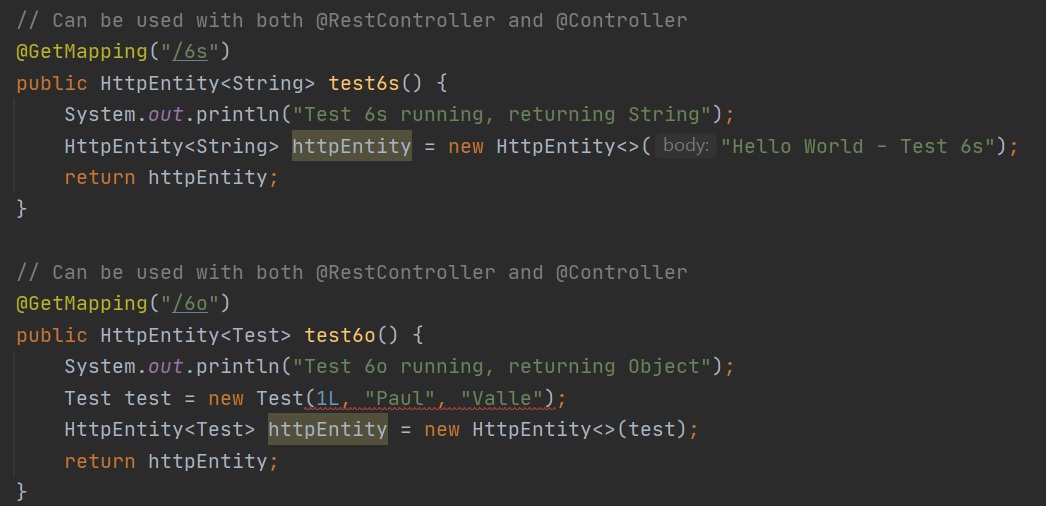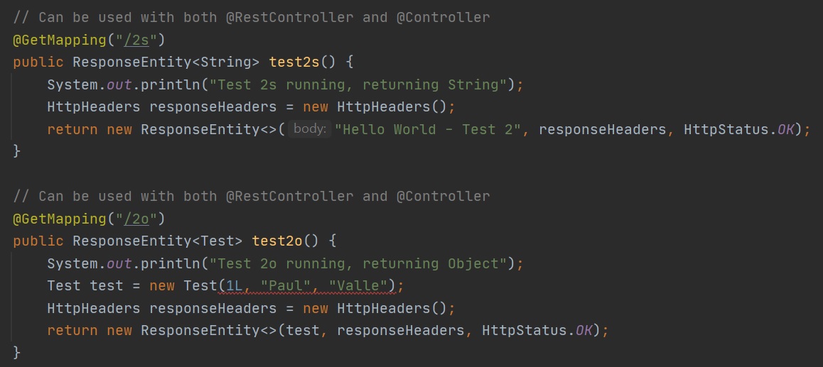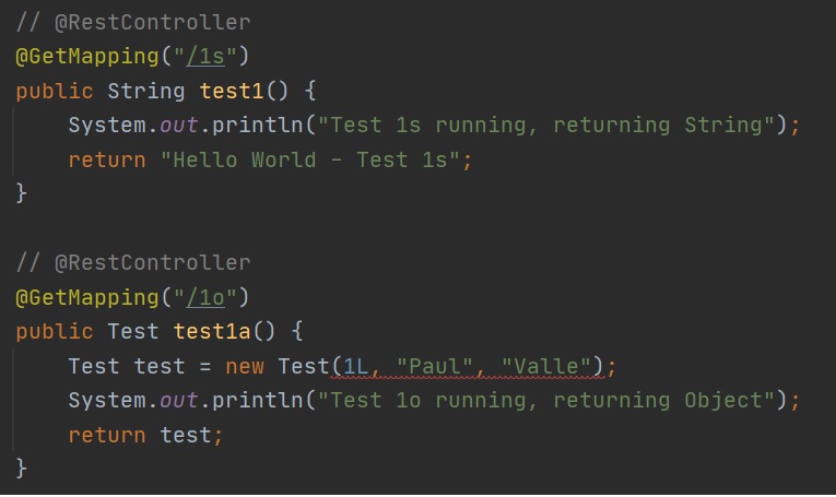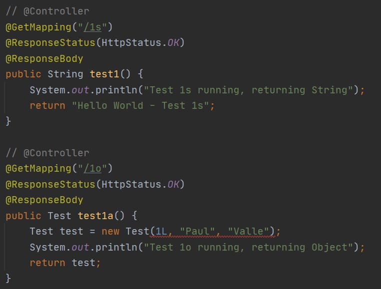 I have a few examples of each of the API implmentation for the above to explain each one in more detail, first we start with a plain old method, to get it to work with @Controller (left-hand screenshot) you need to use the @ResponseBody annotation, you can also optionally use the @ResponseStatus annotation as well. If using the @RestController (right-hand screenshot, which is actually @Controller and @ResponseBody) you can reduce the code a little. I have given examples of using both returning a String and an Custom object.