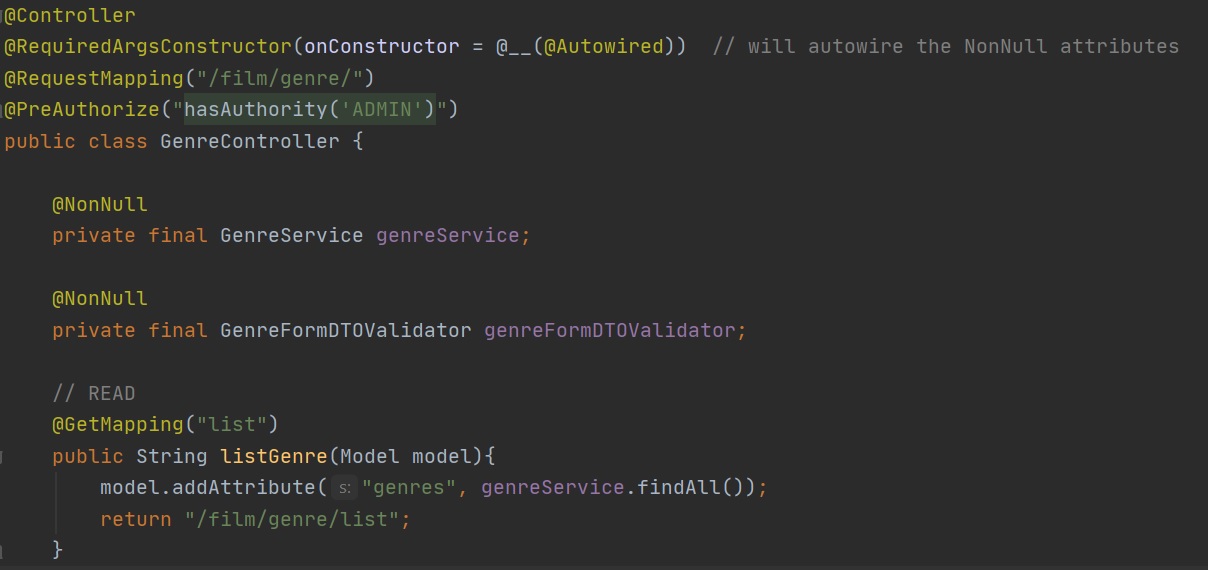 In the below example we use the @RequestMapping on the class as a whole and thus the first method will be invoked if the URL is http://localhost:8080/film/genre/list using the HTTP GET method. You might have noticed the @RequiredArgsConstructor which is explained in my Lombok section. I will cover @PreAuthorize in my security section.