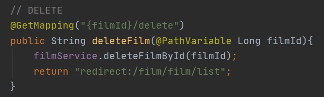 In the last section we covered basic controllers, now I will cover passing parameters to controllers, so for example lets say we want to delete a film from the database, the user will use the browser to select the film and will then send the request (HTTP GET method), the URL string (http://localhost:8080/film/1/delete) will contain the ID (1 in this example) of the film (field is surrounded by curly braces) to be deleted, in the parameters list you can see that we map the passed filmId to the Long filmId object using the @PathVariable anotation, the filmId can then used with the film service to delete the film. @PathVariable is a Spring annotation which indicates that a method parameter should be bound to a URI template variable.