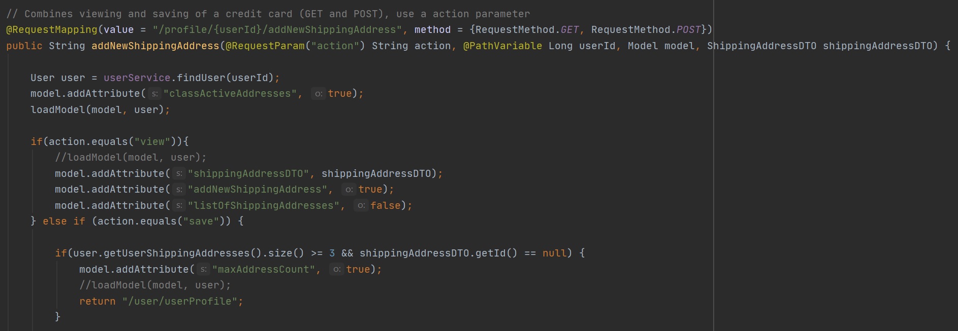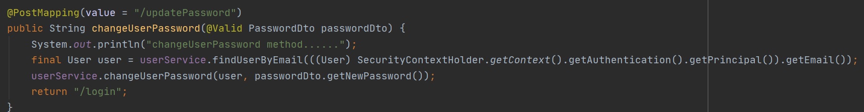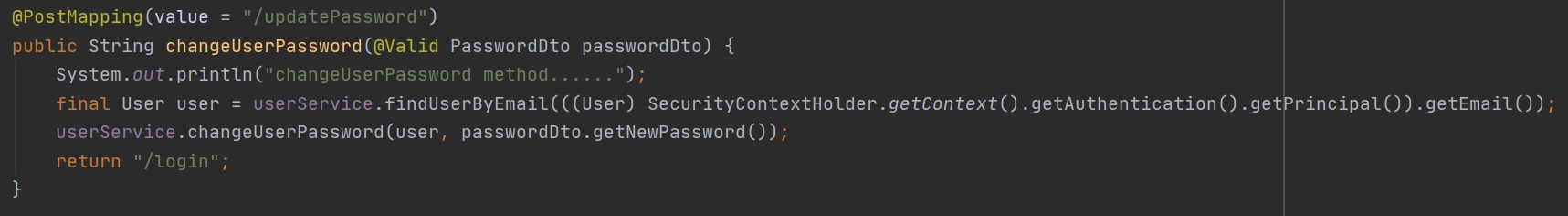 Below are some examples of using the annotations, at the moment just focus on the annotation, you can see that I have used specific annotations (@GetMapping, @PostMapping) and a generic mapping (@RequestMapping), basically when the clients web browser sends a HTTP request Spring Boot will look at the URL and the HTTP method and route to the specific method. For example taking the top example all traffic with http://localhost:8080/ using the GET method will invoke the top method, in the second example all traffic with http://localhost:8080/updatePassword using the GET method will invoke the second method, etc. The Generic @RequestMapping routes traffic from http://localhost:8080/profile/changePassword using either HTTP GET or POST methods.