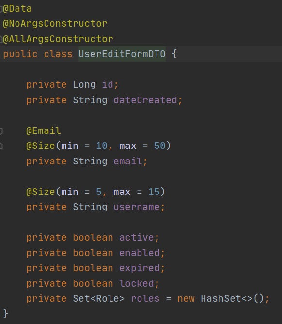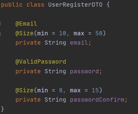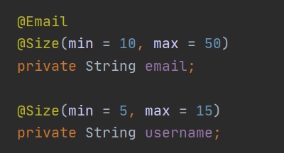 Lets start with Springs Validation Constraints, you place a constraint on the fields in the object itself, as I am using MapStruct DTO's my constraints are placed on these objects, in the below screenshot you can see two constraints, the first uses the @Email annotation, this makes sure that the field is a valid email address, the @Size annotation makes sure that the email address is between 10 and 50 characters. The right-hand screenshot displays a custom validation constraint which I will explain in detail below.