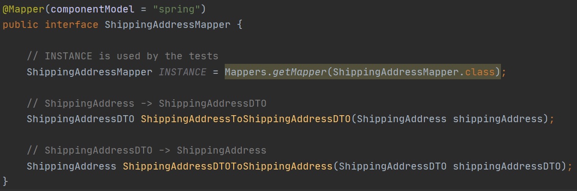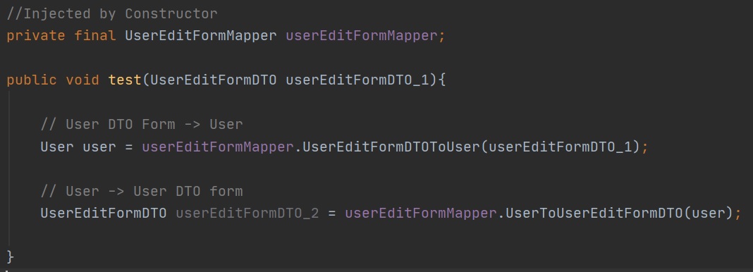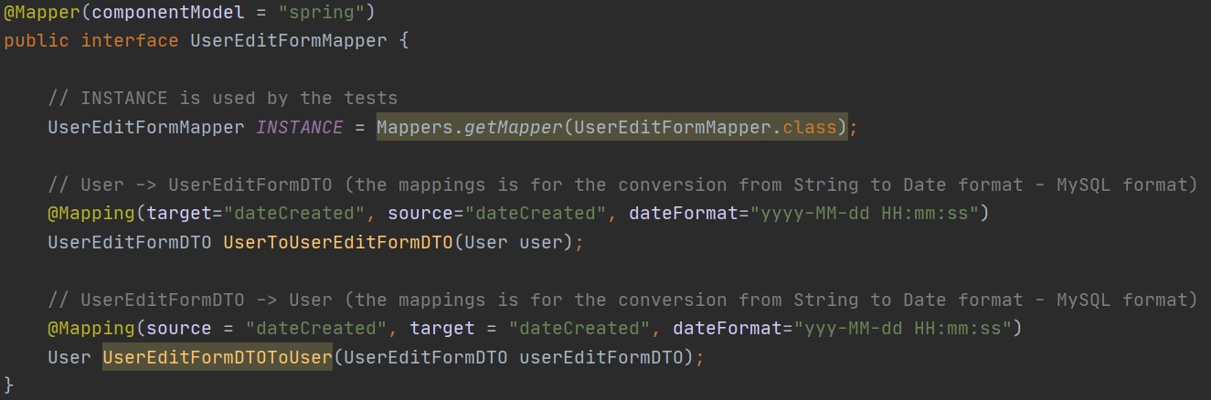 The UserEditForm DTO (left-side screenshot) maps to the User object and is a simple POJO and if you notice you can also use Lombok, you can leave out any fields that you don't want to use for example the password field. The DTO object can then be used between the presentation layer and the service layer securely. In the MapStruct interface we start with the @Mapper annotation, this marks the interface as a mapping interface and lets the MapStruct processor kick in during compilation. We then have two methods to map in both directions DTO to Object and Object to DTO, the source of the object is passed as a parameter. There are times where you might need a type convertion as you can see in the example I have one for the dateCreated field from String to MySQL date format. To use Spring IoC in our mapper(dependency injection), we need to add the componentModel attribute to @Mapper with the value spring.