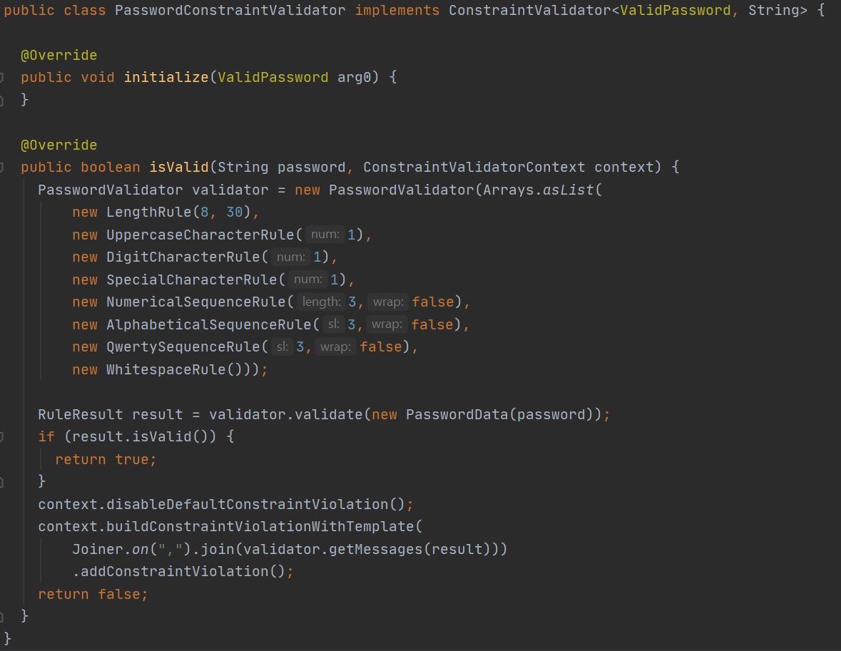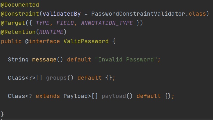 First we create the annotation as seen in the left-hand screenshot, notice the @Target which defines this as a field annotation, we also define a default message, the right-hand screenshot is the validator itself, notice we use the ValidPassword annotation as a argument to the ConstraintValidator interface thats how we bind the two together, we then have to implement the isValid() method and if you notice all we need is to return a boolean value, inside the method we use passay to define the rules and to make sure that the password meets those rules otherwise false is returned. Thats all there is to creating your own Validator.