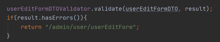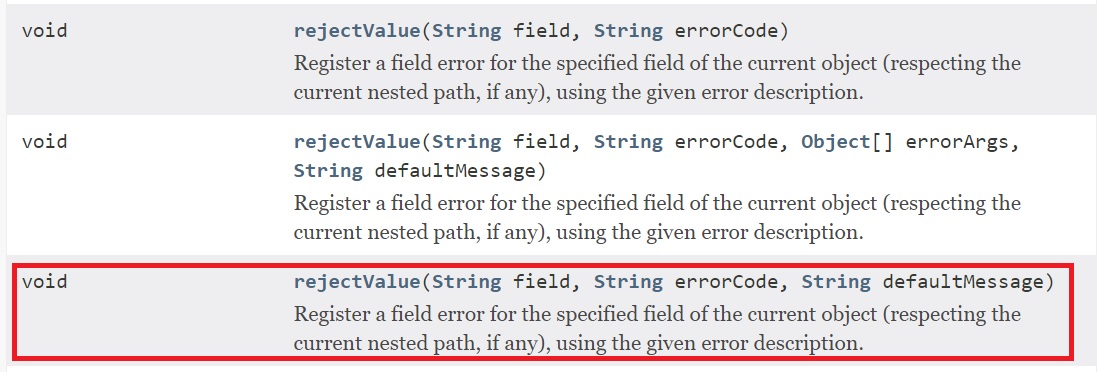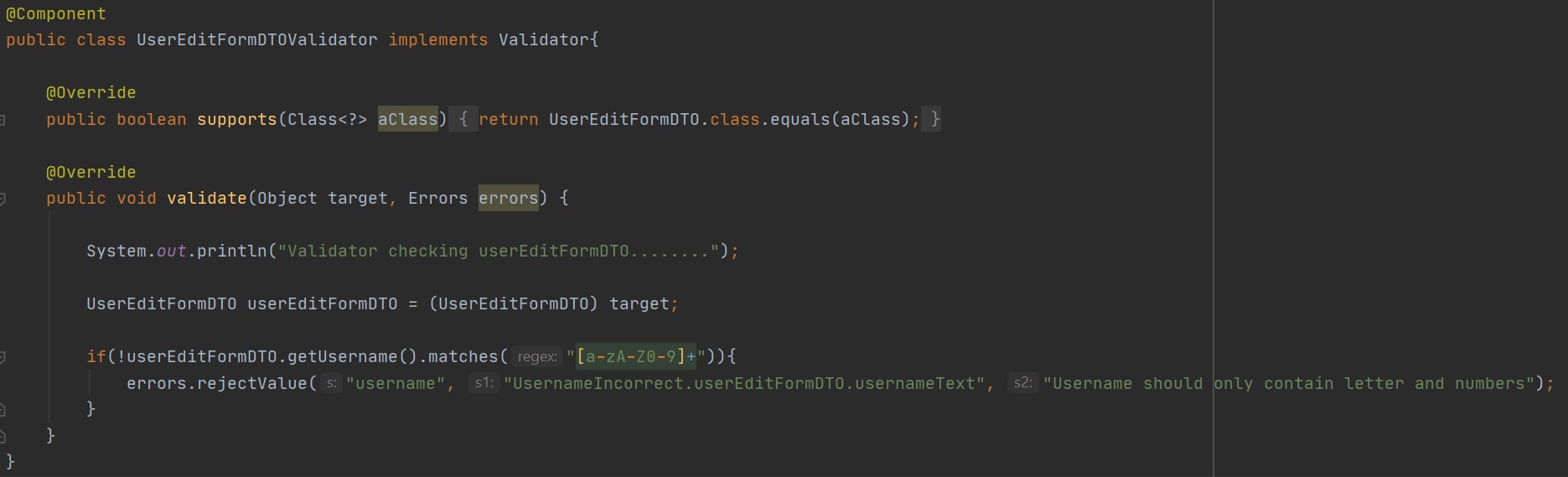 Below is the validator itself (left-hand screenshot), we use the @Component annotation to make sure its a bean that will be picked up, we implement the Validator interface, override the support and validate methods, its the validate method that you use logic to determine if the object is valid or not, because we are passing a BindingResult object any errors will be reflected in this object and passed back to the main program, you can perform any number or any type of checking, in may case I am checking that the username only contains letters and numbers, the rejectValue method in my case I pass the field, error code and default message as can be seen in the right-hand screenshot.