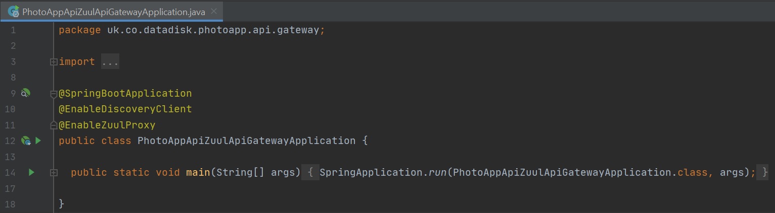 We hadd the @EnableDiscoveryClient to allow us to connect to a Eureka Discover Service and then we add @EnableZuulProxy annotation which allows this application to be a Zuul API Gateway.