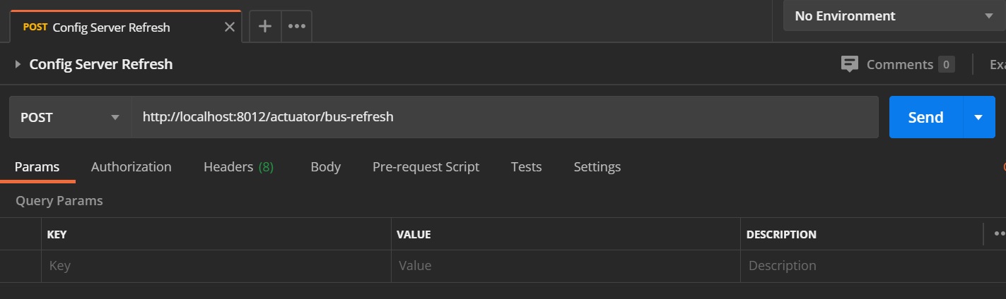 To update (push) any changes to the property files of the applications we are using we send a POST request to the config server http://localhost:8012/actuator/bus-refresh, the changes are broadcast to all the microservice applications (those that have configured/registered)