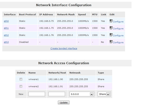The below image is my network setup, as you can see I have three network connections, one for the public network and two for the iSCSI network. I have also added the two ESXi servers to the access configuration which will be used during the iSCSI setup, all ports have been configured at 1000Mb/s.