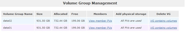 As I mentioned I have two 1TB disk to play around with, I have created two volume groups data01 and data02, each volume group has one disk.