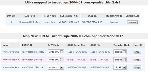 Once the volumes have been created you need to setup the iSCSI part, I have given my volumes target names like filer2.ds1, filer2.ds2 but its up to you on what naming convention you wish to choose. The image below shows one of the volumes mapped to the target, in this case volume filer2ds1 volume is mapped to target filer2.ds1