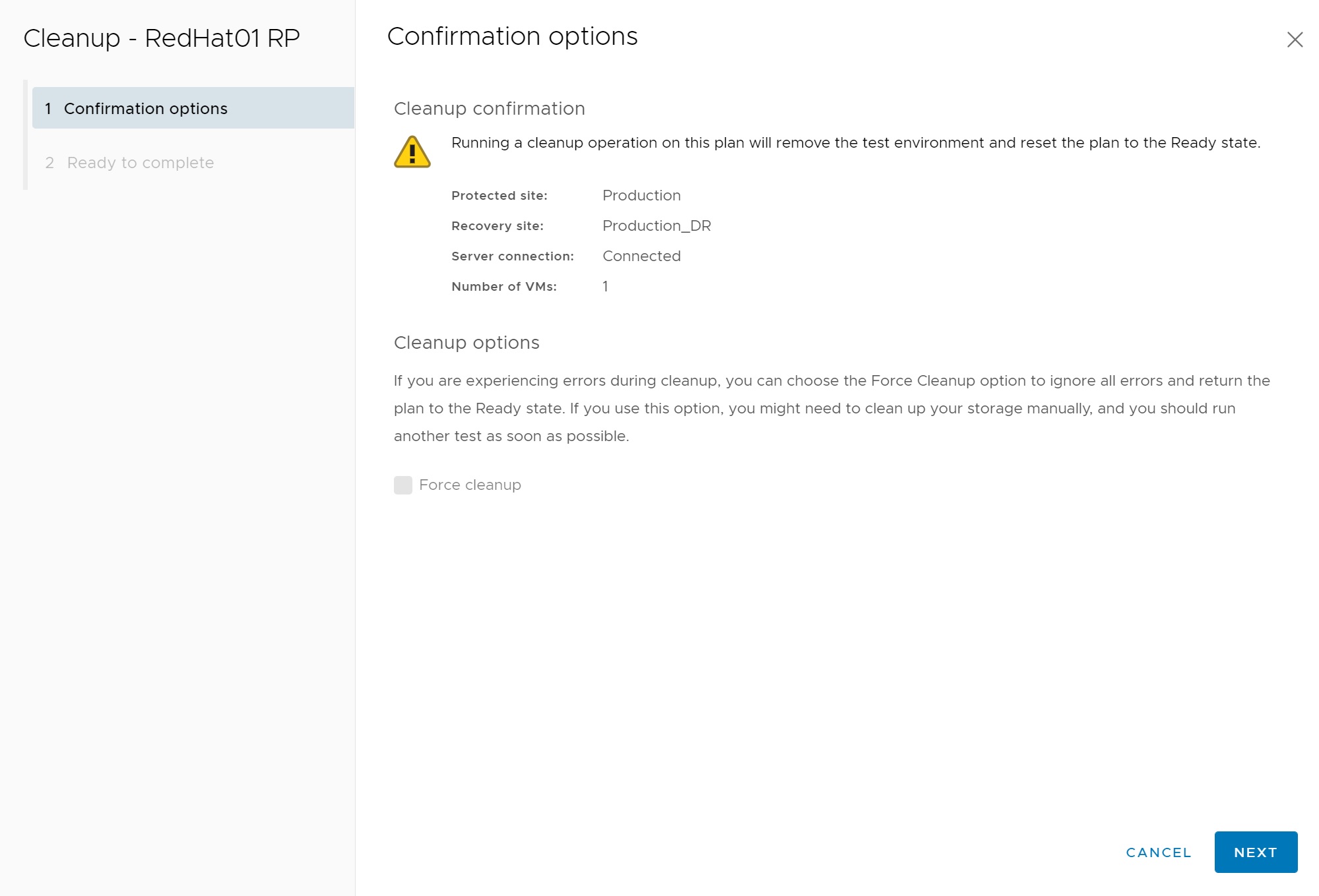 Once you have finished, it's time to cleanup and remove the test VM, return to the Recovery Plan -> Recovery Steps and click on the CLEANUP link as per below