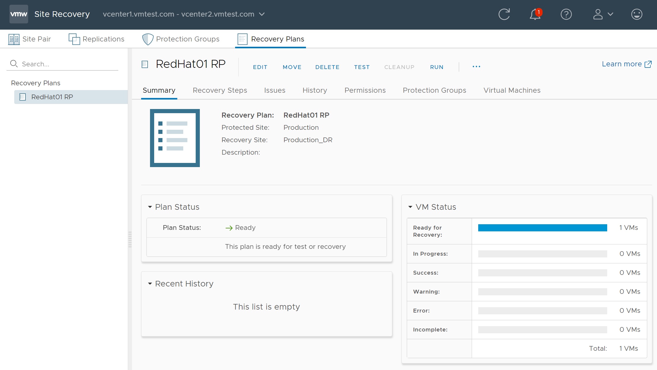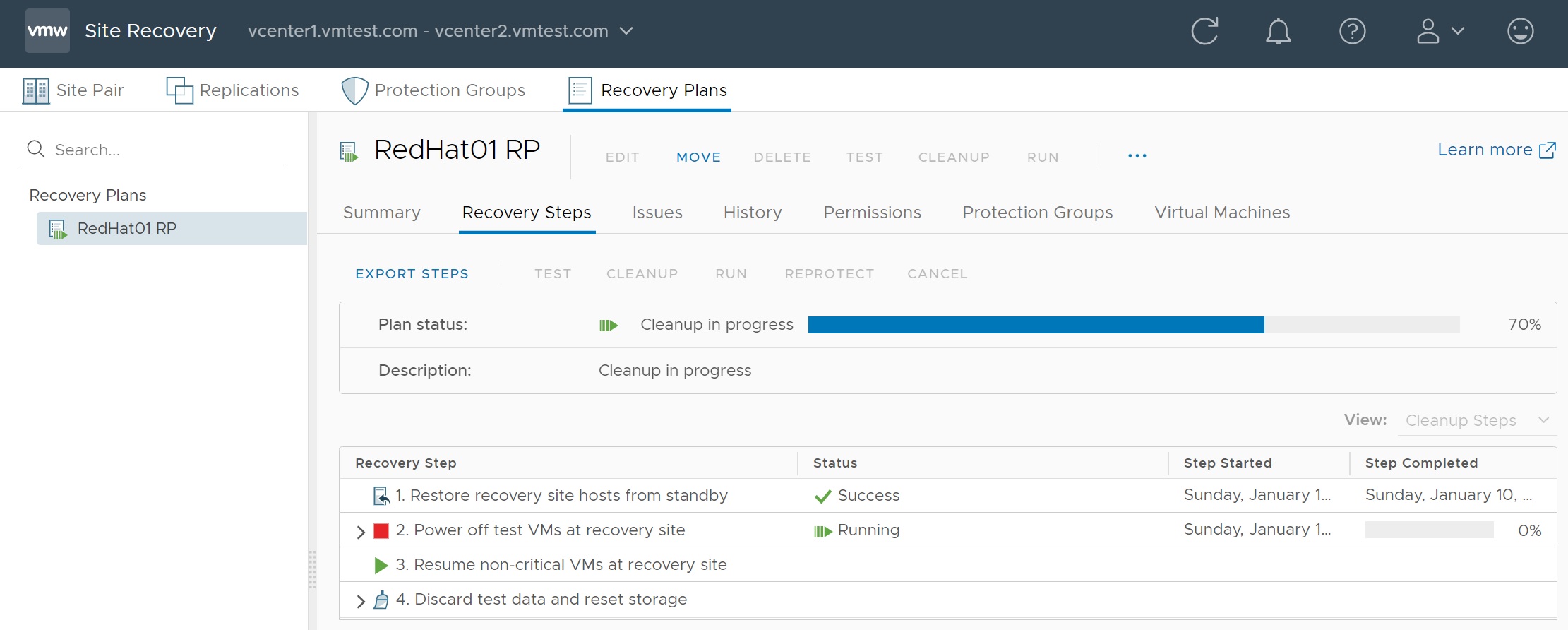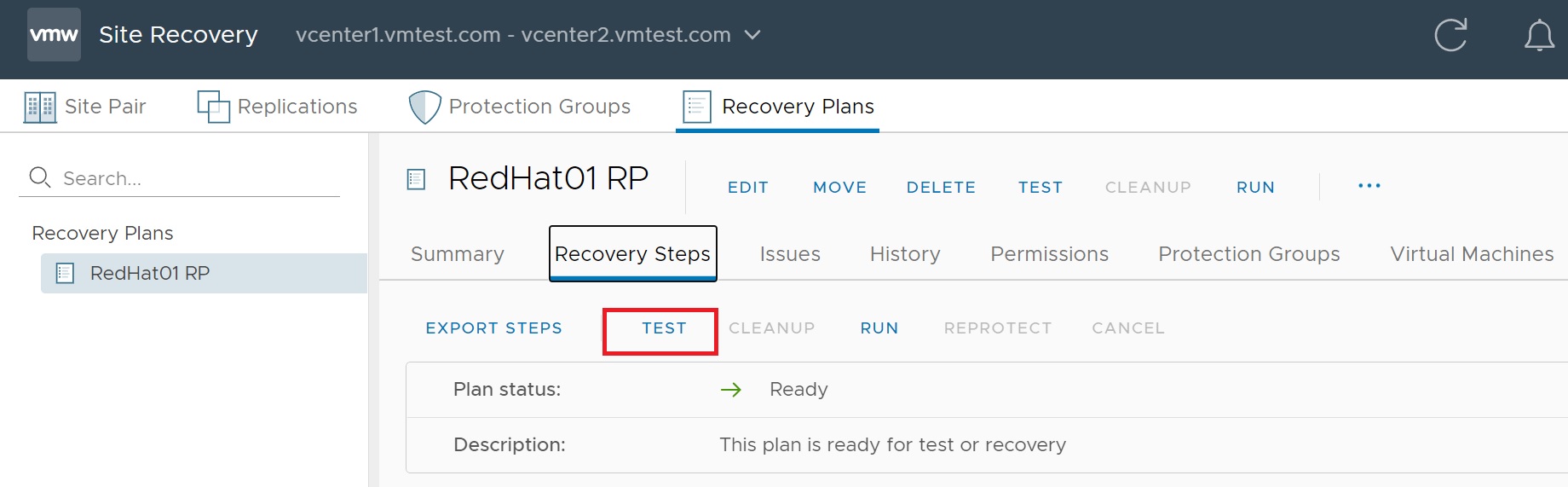 So lets test the recovery of redhat01 VM to the other site (or DC), select the Recovery Plans tab, then select the RedHat01 RP plan (or the one you created), then select the Recovery Steps and the Test link
