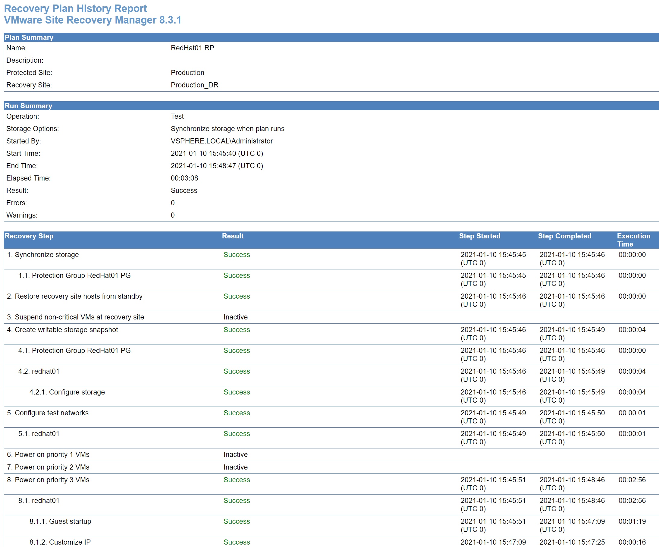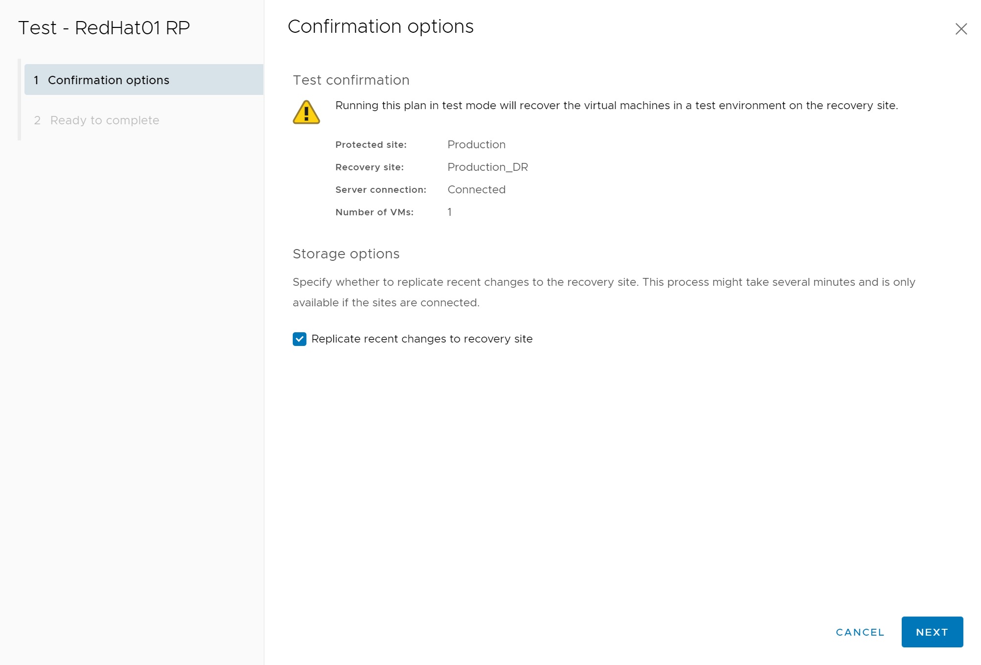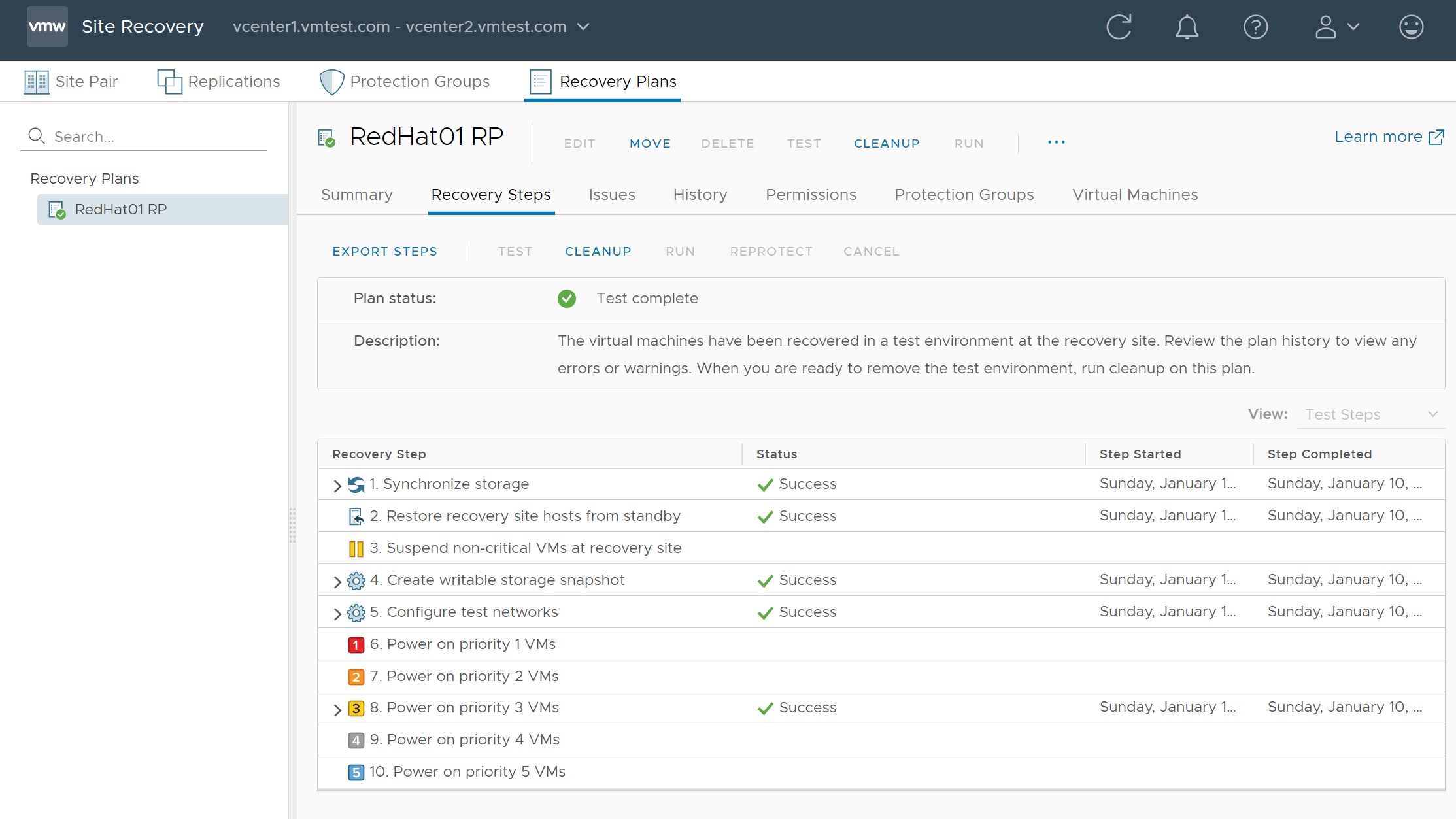 So lets test the recovery of redhat01 VM to the other site (or DC), select the Recovery Plans tab, then select the RedHat01 RP plan (or the one you created), then select the Recovery Steps and the Test link