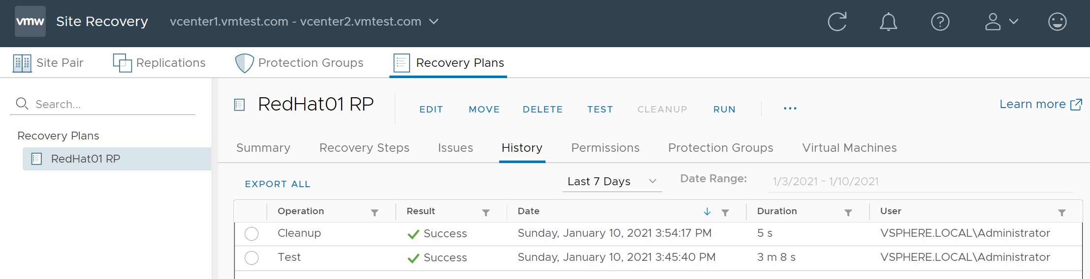 One handy screen is the history screen here you can see when the recovery plan was tested, cleaned up, etc.