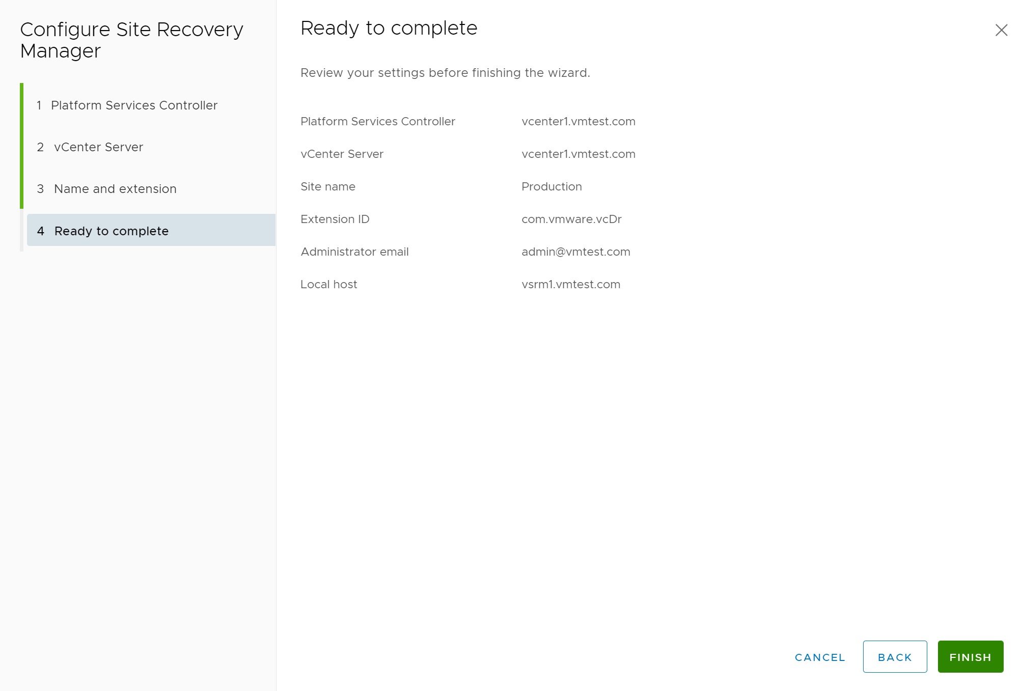 Finally we get to the summary screen, click Finish to pair the two SRM servers