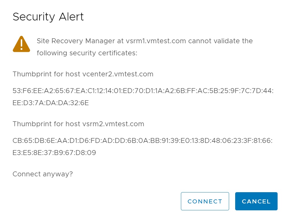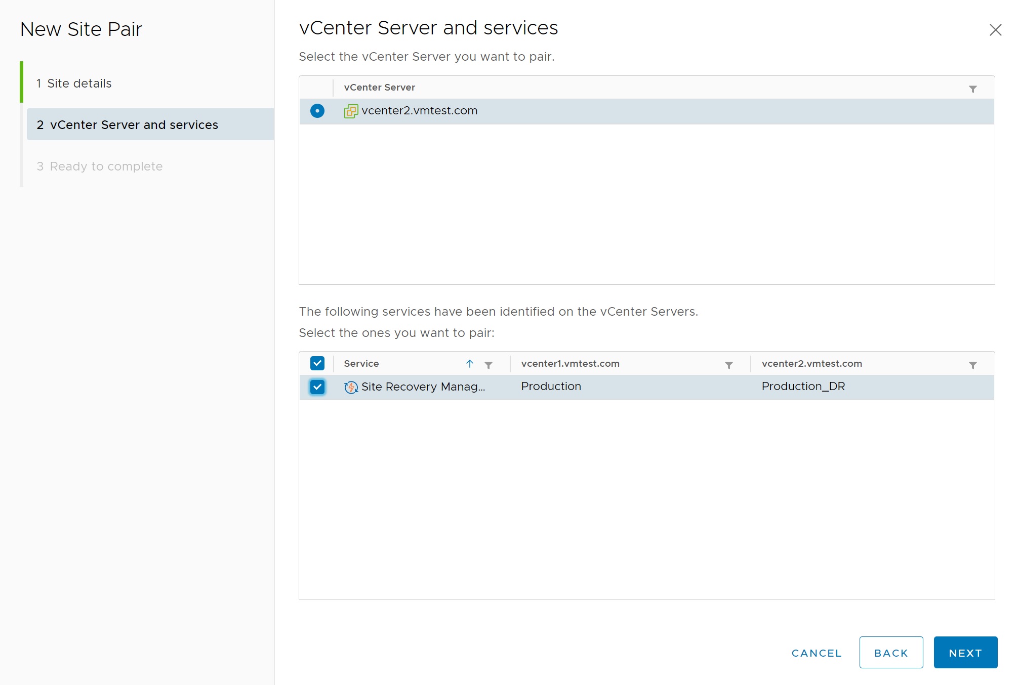 In the first setup screen we identify the vCenter we wish to pair with, we can see the local vCenter (vcenter1) and the secondary site vCenter (vcenter2)