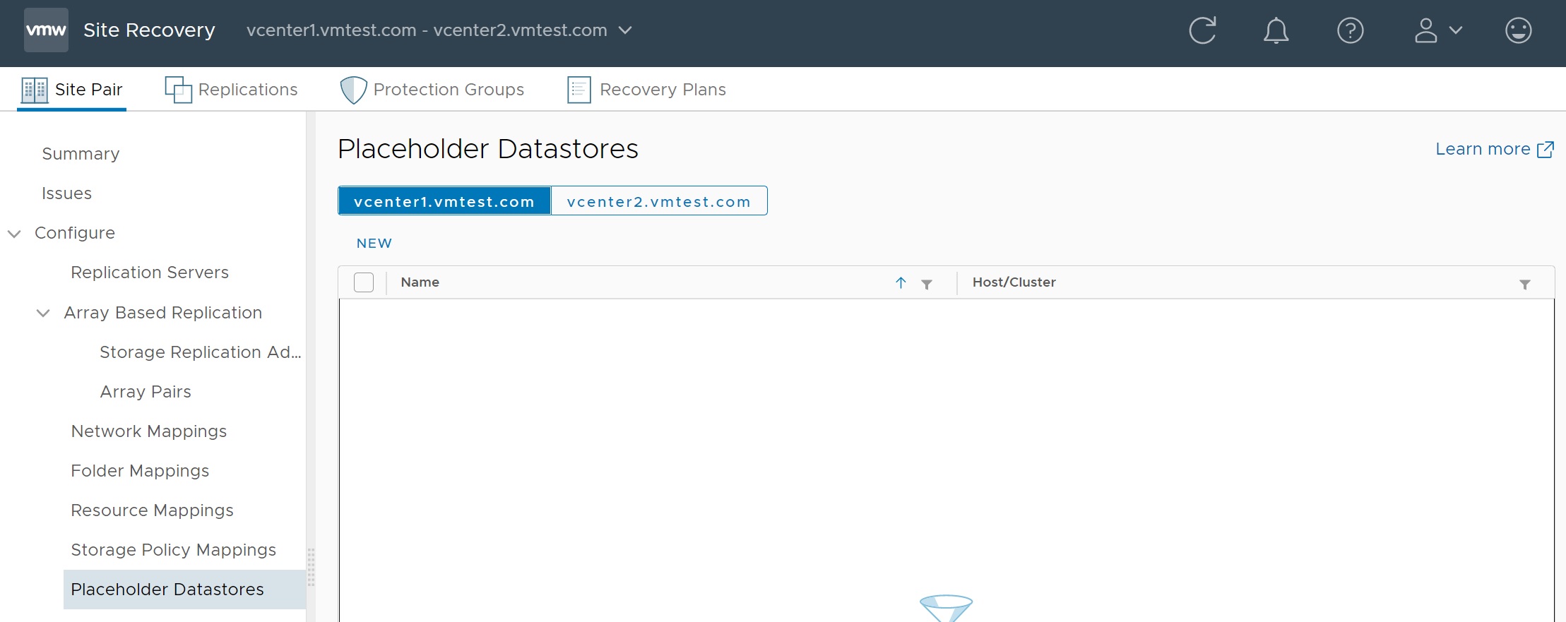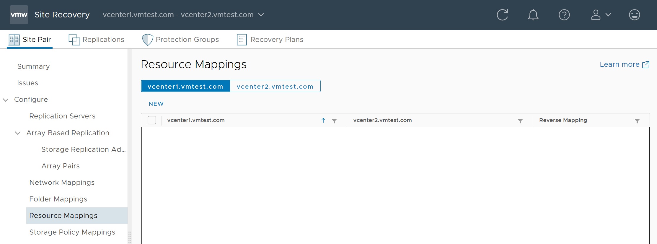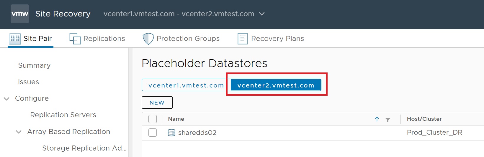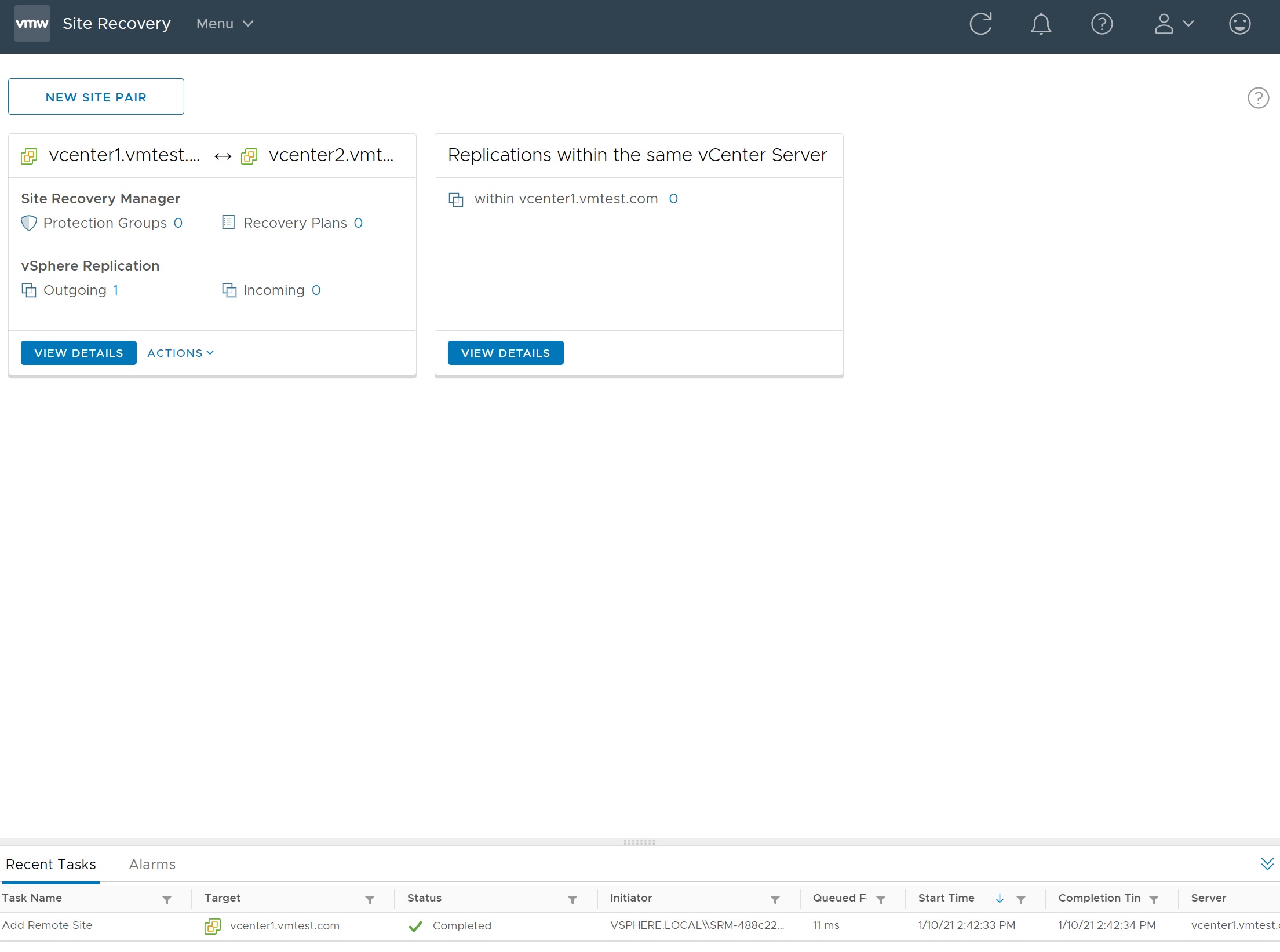 Returning to the pairing screen you will notice now that we have the Site Recovery Manager pairing, which you will see a protection group and recovery plans fields.