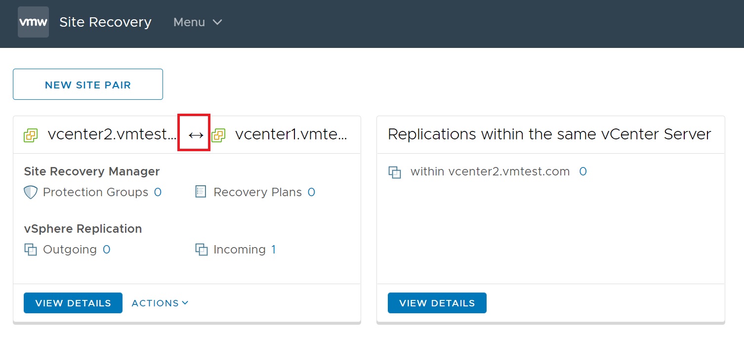 Looking at the other vCenter server we can see the pairing, notice the bidirectional arrow meaning we could recover VM's in both directions if we need too.