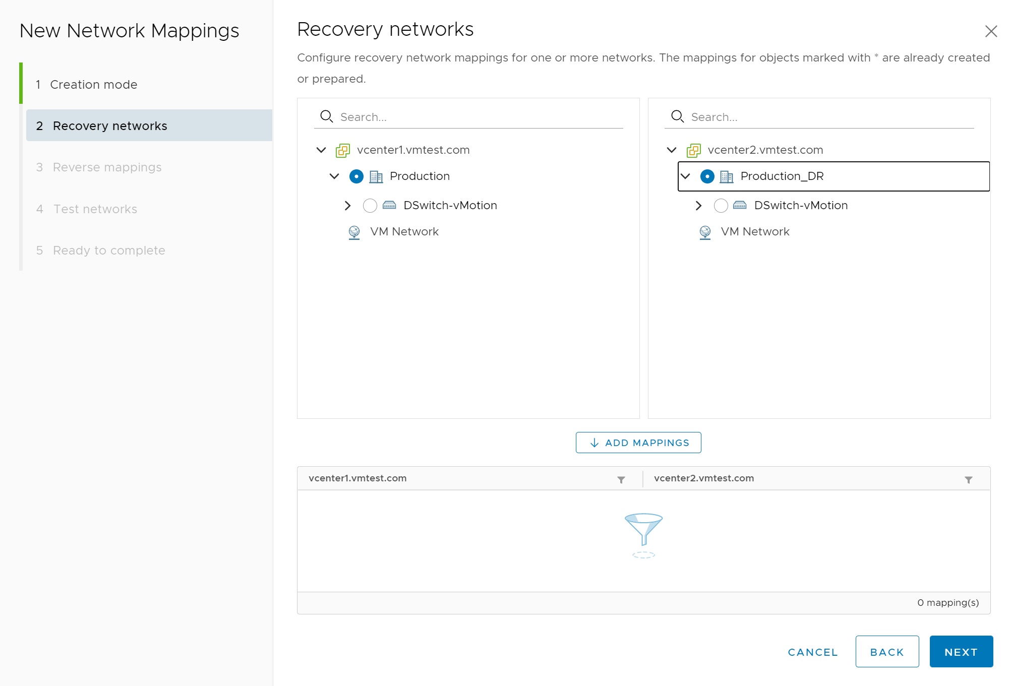 Next we identify the networks that will be used for recovery, try and use more than one network for redundancy. Once identified don't forget to select the ADD MAPPINGS button