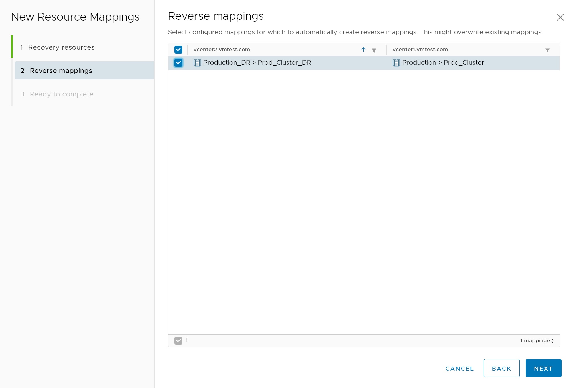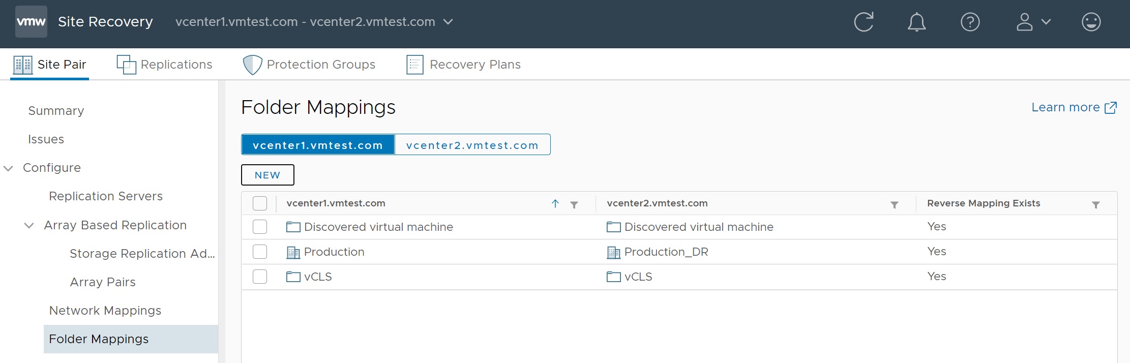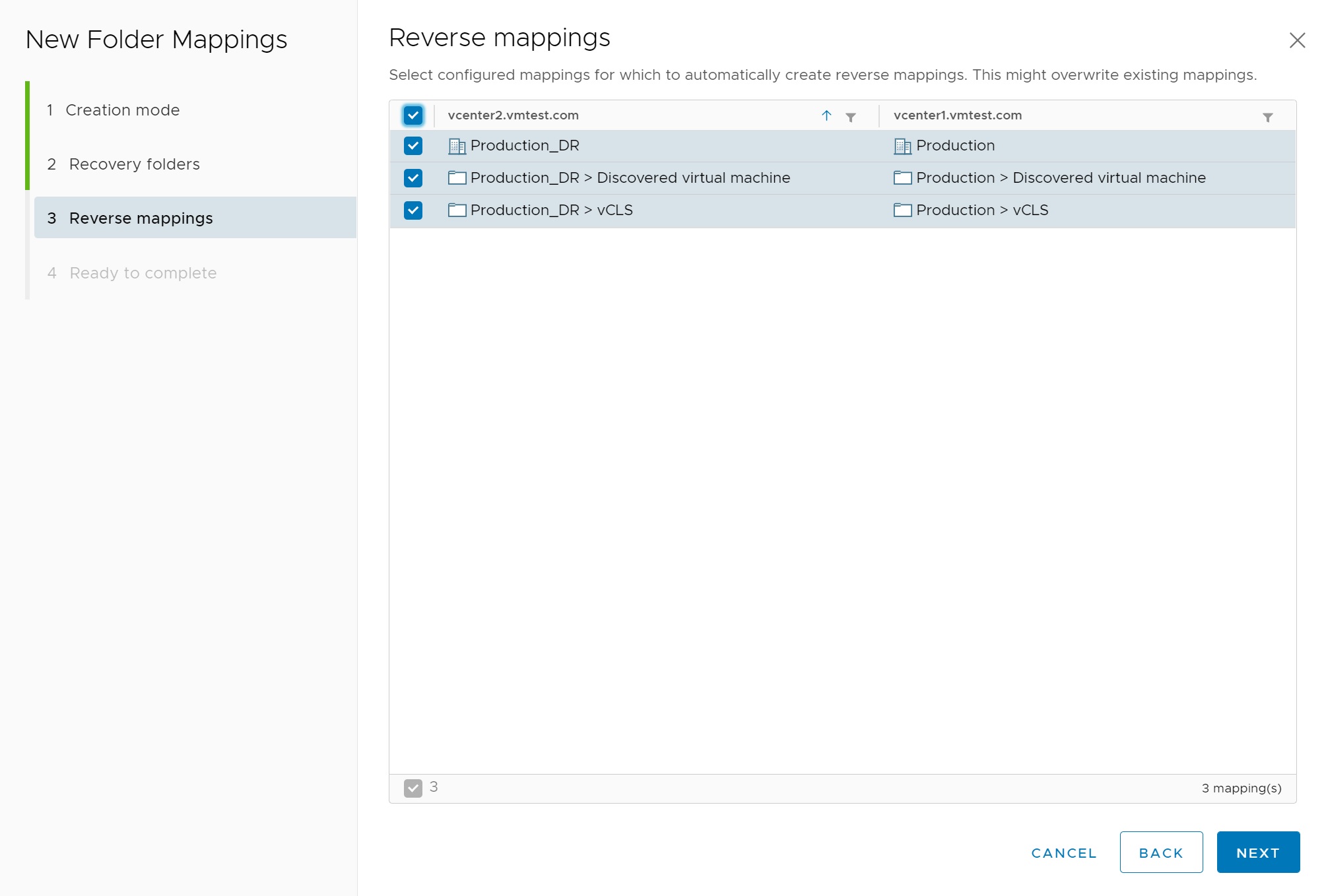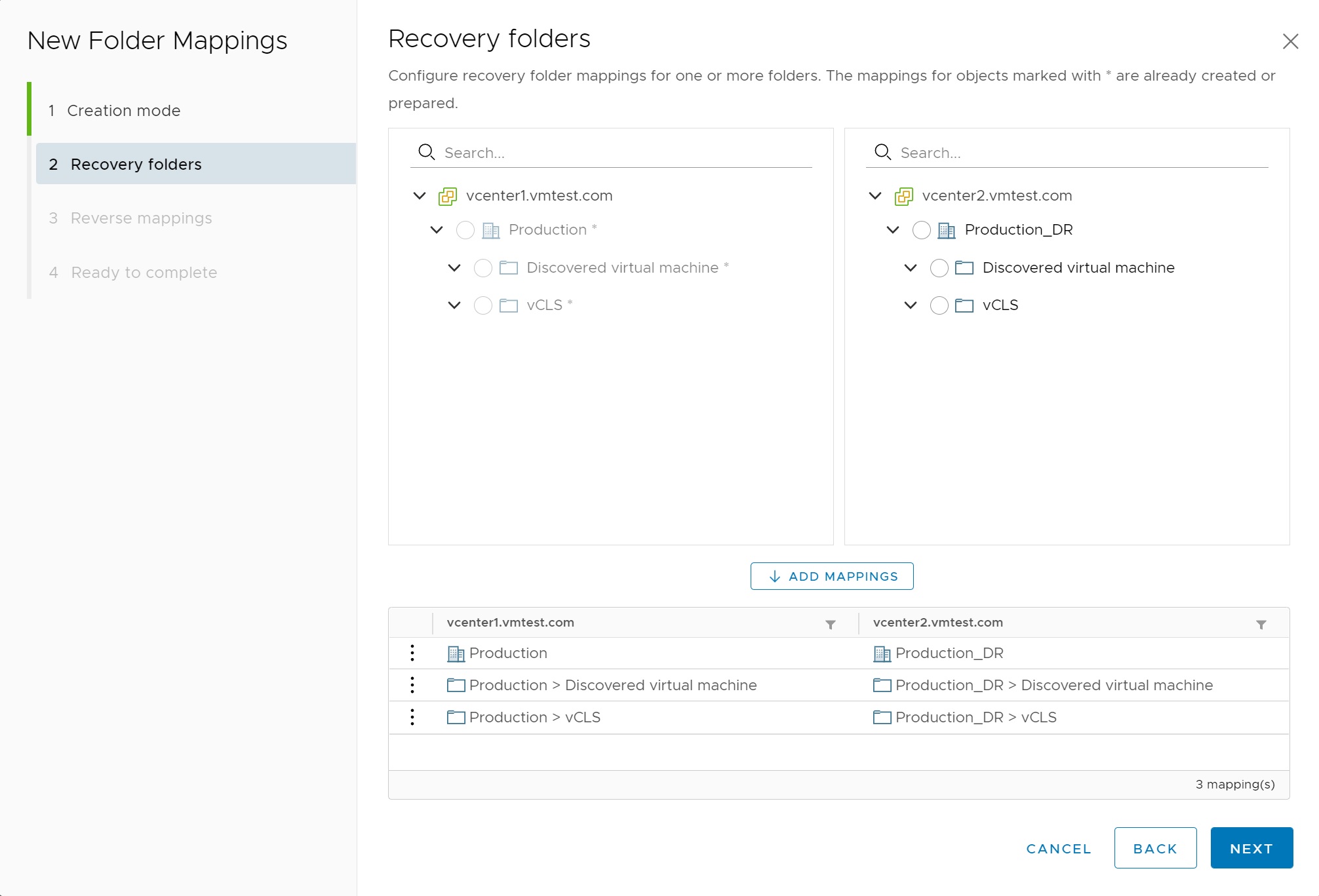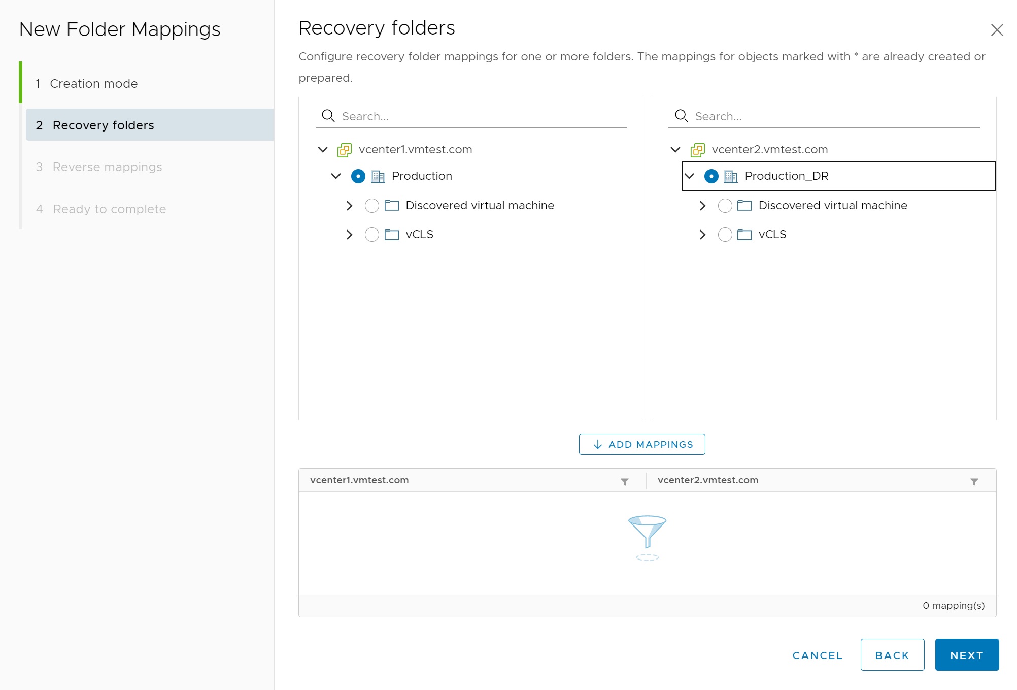 Next we move on to setting up the folder mappings, here we Map datacenters or virtual machine folders on the protected site to datacenters or virtual machine folders on the recovery site.