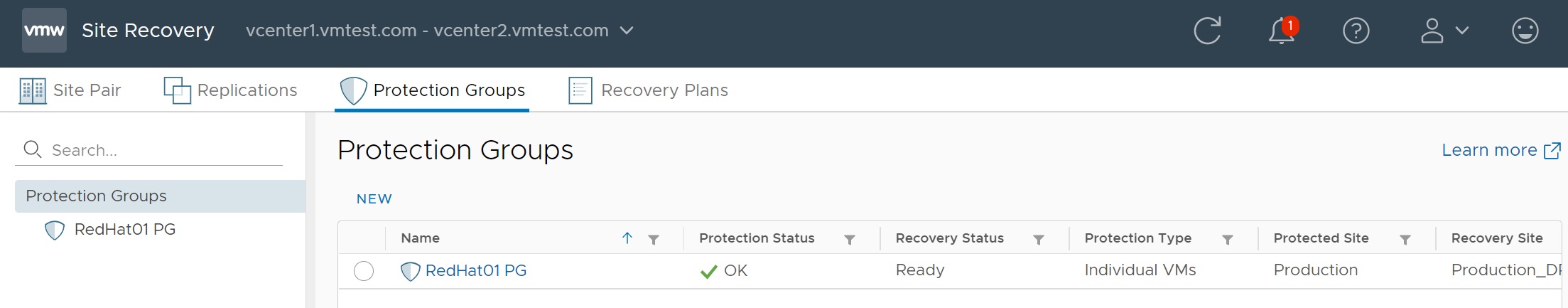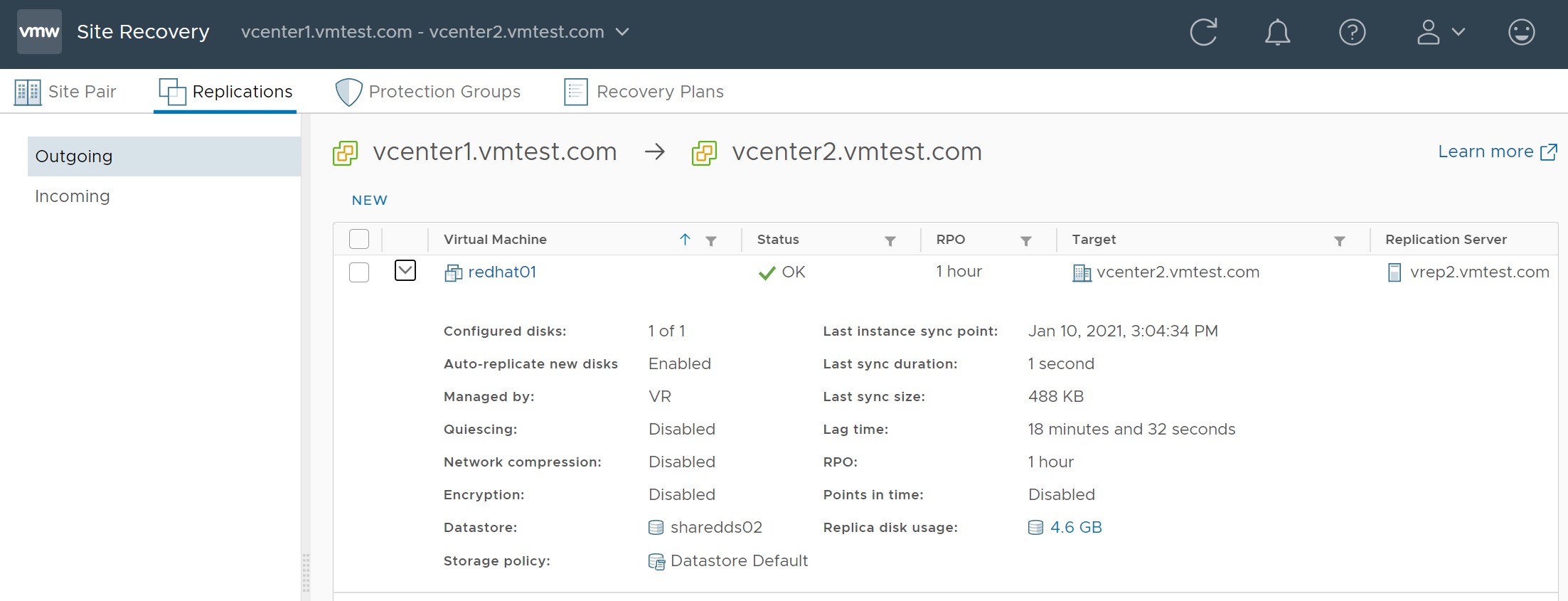 Just to recap if we go to Replications -> Outgoing we can see that redhat01 VM is being replicated across the two sites