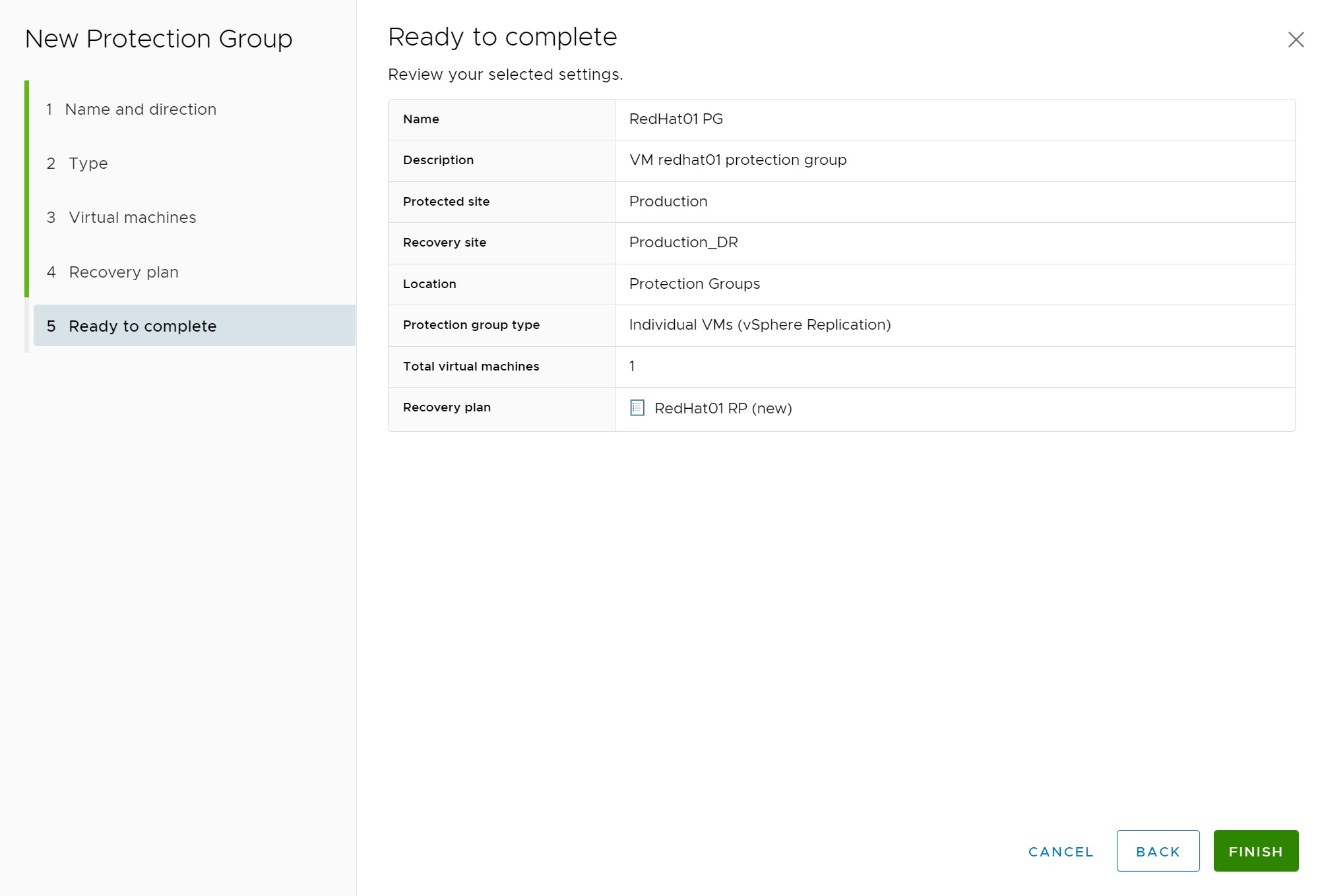The first setup screen requires some details of the protection group itself, name, description, the direction of the protection, in my example redhat01 VM normally resides in the Production side with the replicated one on the Production_DR side, should Production go down then we can restart it on the Production_DR side.