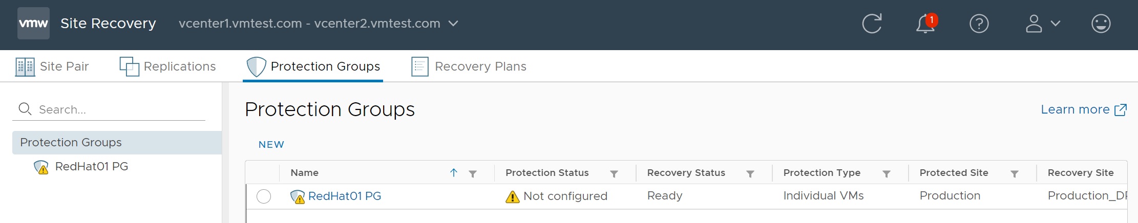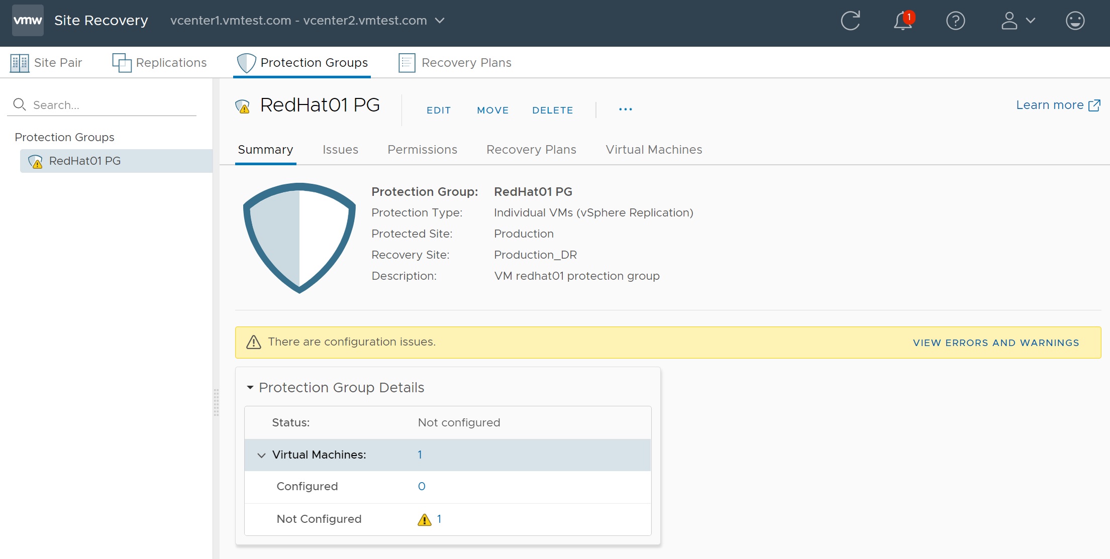 Return to the protection group main screen we can see that the protection group has been created, we can also see that there is an issue, click the protection group to get more details