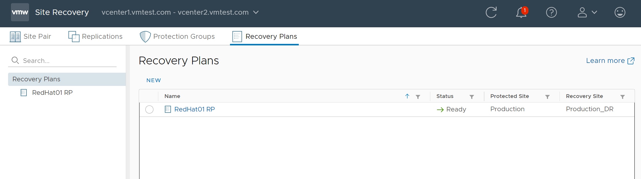 You can also view the recovery plans by selecting the Recovery Plans tab at the top, here you can see the recovery plan I created earlier, so you can create specific plans here and then attach them to a protection group later