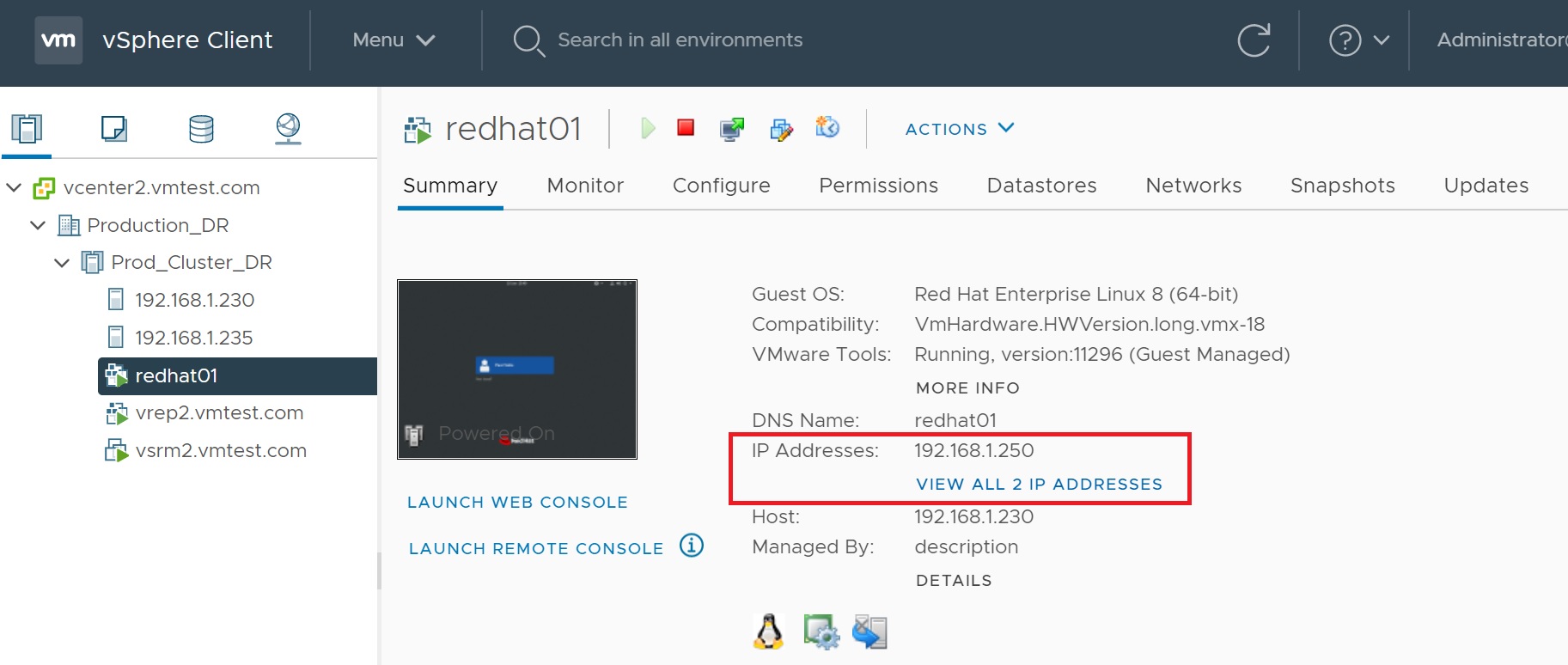 Going to the vCenter2 we now see that a replicated redhat01 VM has been copied and is up and running, remember that we asked to create a separate network when testing VM's which is why you see 2 IP address, so this won't impact the LIVE redhat01 that is currently running on the other production cluster, now you can login to this server and check the RPO times and that files are being kept up to date by the replication process, etc.